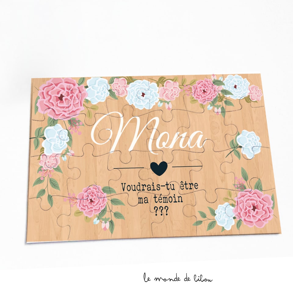 Le Monde de Bibou a imaginé ce puzzle pour une demande originale, tout en fleurs roses et blanches sur un fond imitation bois : un style romantique et vintage idéal pour annoncer cet événement heureux. Cette belle surprise plaira à coup sûr à la future témoin !