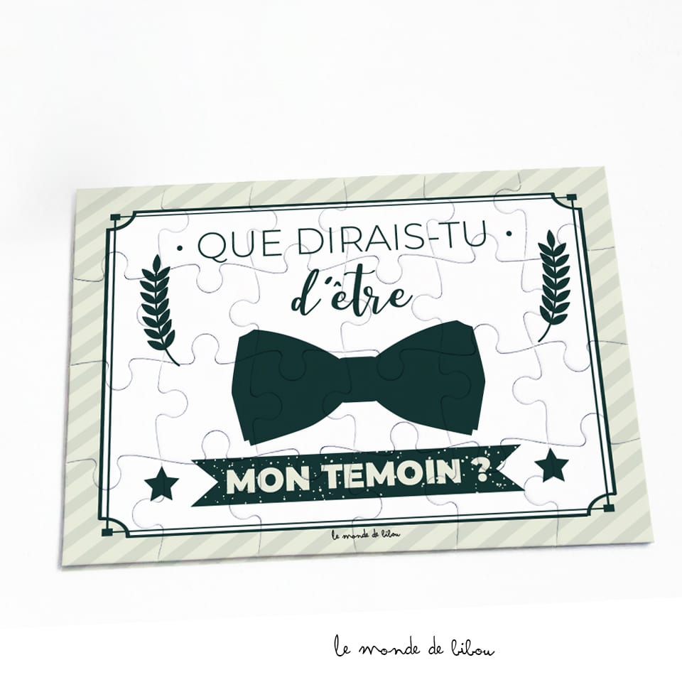 Notre puzzle demande témoin pour homme vous plaît ? Retrouvez toutes nos demandes originales pour les Témoins de mariage sur la boutique (puzzles, cartes bijou, sac tote bag, cartes à gratter…)