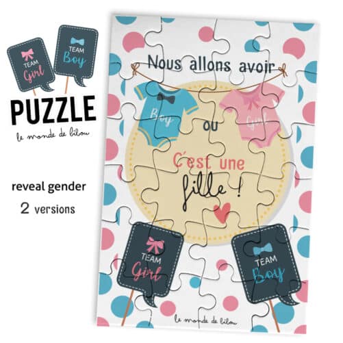 Vous connaissez enfin le sexe de votre futur bébé et souhaitez l’annoncer à votre entourage ? Voici un joli Puzzle Gender reveal fille ou garçon à offrir à votre famille et vos amis pour annoncer la bonne nouvelle. C’est une surprise qui fera plaisir à coup sûr, une annonce dont on se souviendra longtemps. C’est également une chouette animation lors d’une baby shower !