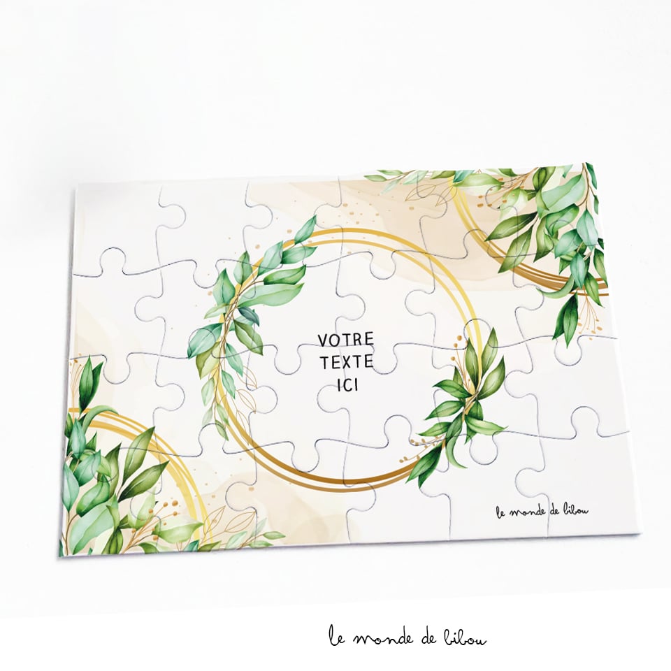 Faites une annonce ou une demande de manière originale grâce à notre Puzzle personnalisable Eucalyptus. C’est votre propre texte que nous inscrivons dans le cercle d’eucalyptus pour une personnalisation à 100%. Toutes les demandes sont possibles, que ce soit pour un mariage, une naissance, un Baptême ou toute autre évènement heureux… Le thème est sobre tout en étant très actuel, on aime le côté bohème chic.