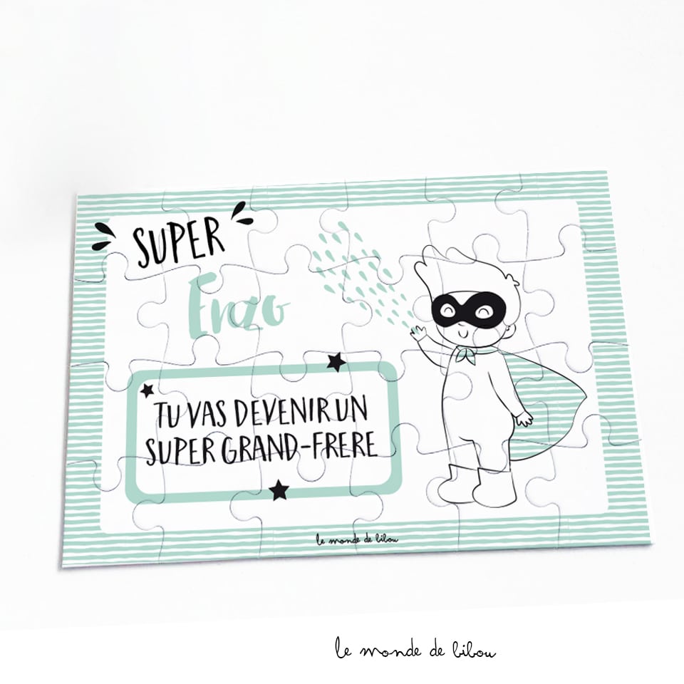 Un puzzle surprise, à offrir au futur grand-frère pour faire une jolie annonce de votre grossesse de manière originale. Le Puzzle pour futur grand-frère annonce originale arrivera désassemblé dans son petit sac de rangement, il sera donc nécessaire de le reconstituer pour découvrir l’annonce. Le futur grand-frère découvrira alors le message en reconstituant le puzzle que nous avons crée sur le thème Super-Héros avec la bonne nouvelle « Tu vas devenir un super grand frère ».