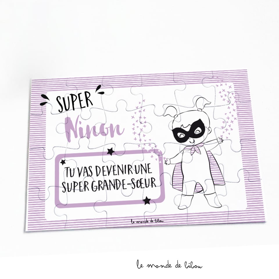Un Puzzle pour future grande-sœur, à offrir à votre ainée pour annoncer de manière originale qu’elle va bientôt avoir un petit frère ou une petite sœur. Le puzzle arrivera désassemblé dans son petit sac de rangement, il sera donc nécessaire de le reconstituer pour découvrir l’annonce. La future grande-sœur découvrira alors le message en reconstituant le puzzle que nous avons crée sur le thème Super-Héros avec la bonne nouvelle « Tu vas devenir une super grande sœur ».