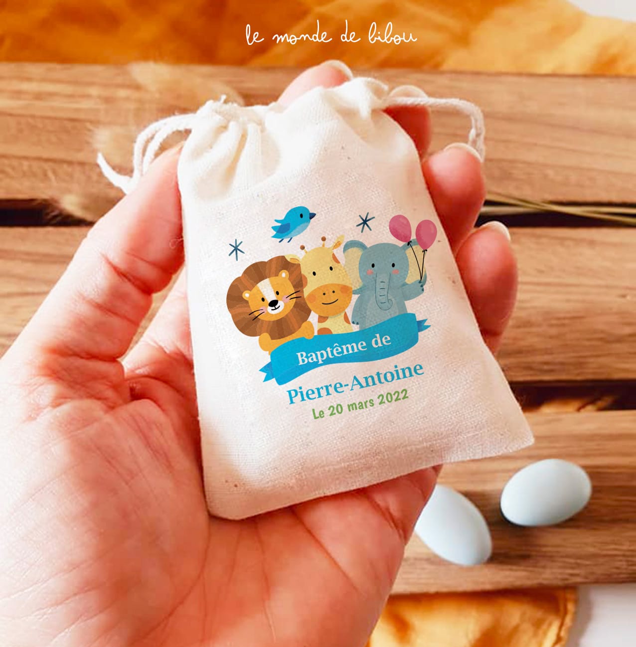 Ce ravissant petit Sac à dragées animaux de la jungle est personnalisable avec le prénom de l’enfant et la date de l’évènement. Le cadeau idéal à offrir à vos invités lors de votre évènement, que ce soit un Baptême, une Communion ou un anniversaire.
