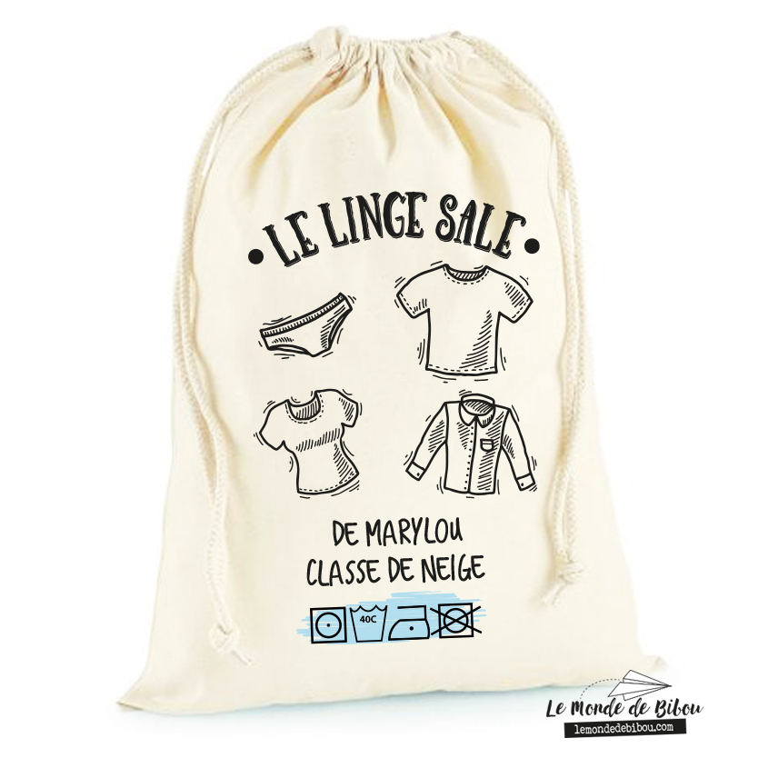 Voici un Sac à linge sale personnalisé, à glisser dans les valises ou les sacs de vos enfants lors de leurs déplacements comme les vacances chez papy et mamie ou chez papa. Mais également lors de la classe découverte, un voyage scolaire ou encore pour une compétition sportive… Il permet d’éviter que le linge propre ne se mélange avec le linge sale. Grâce à ce sac vous ne mélangerez plus les vêtements des membres de la famille.