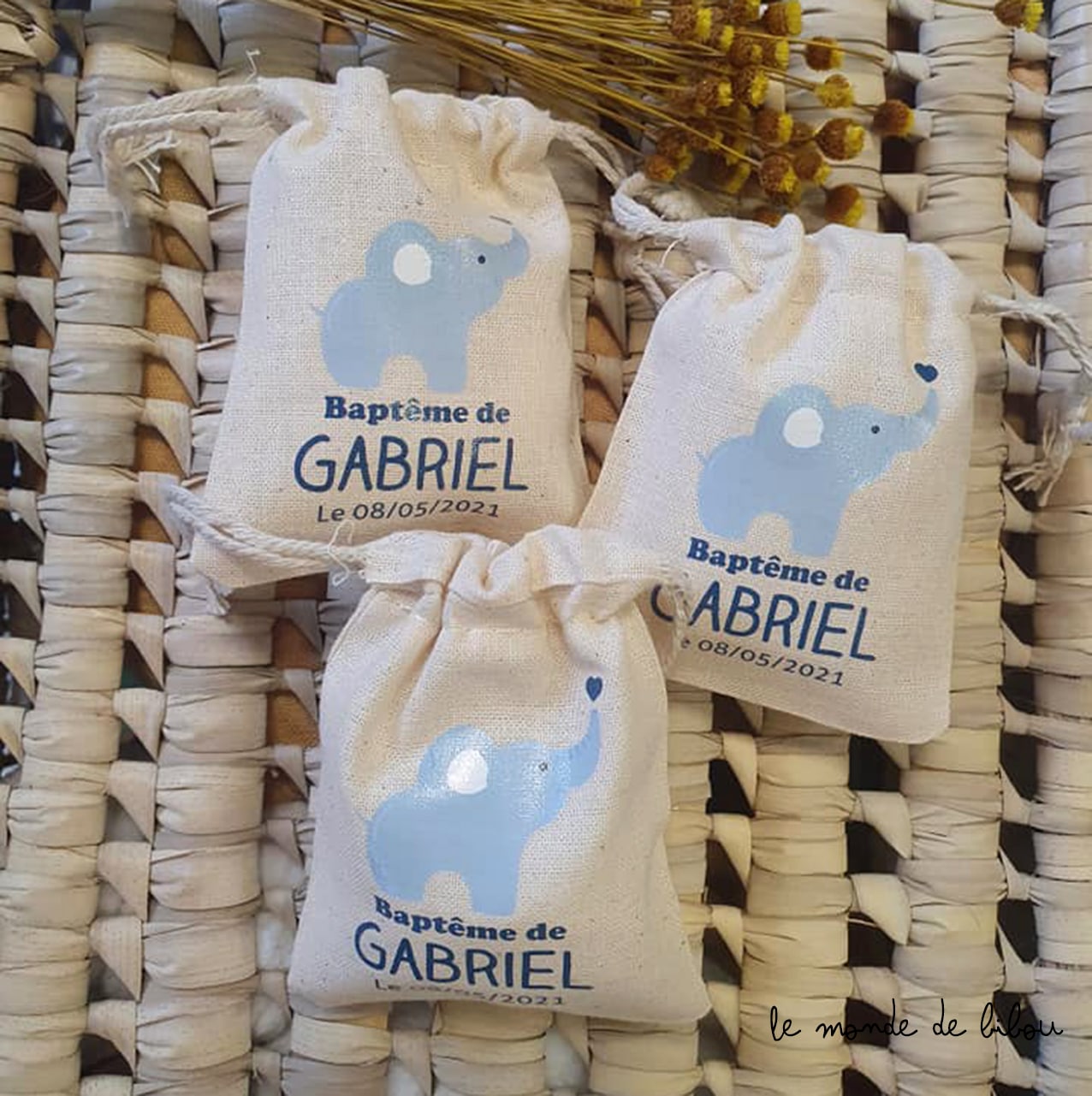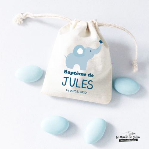 Ce ravissant petit Sac ballotin dragées Éléphant est personnalisable avec le prénom de l’enfant et la date de l’évènement. Le cadeau idéal à offrir à vos invités lors de votre évènement, que ce soit un Baptême, une Communion ou un anniversaire.
