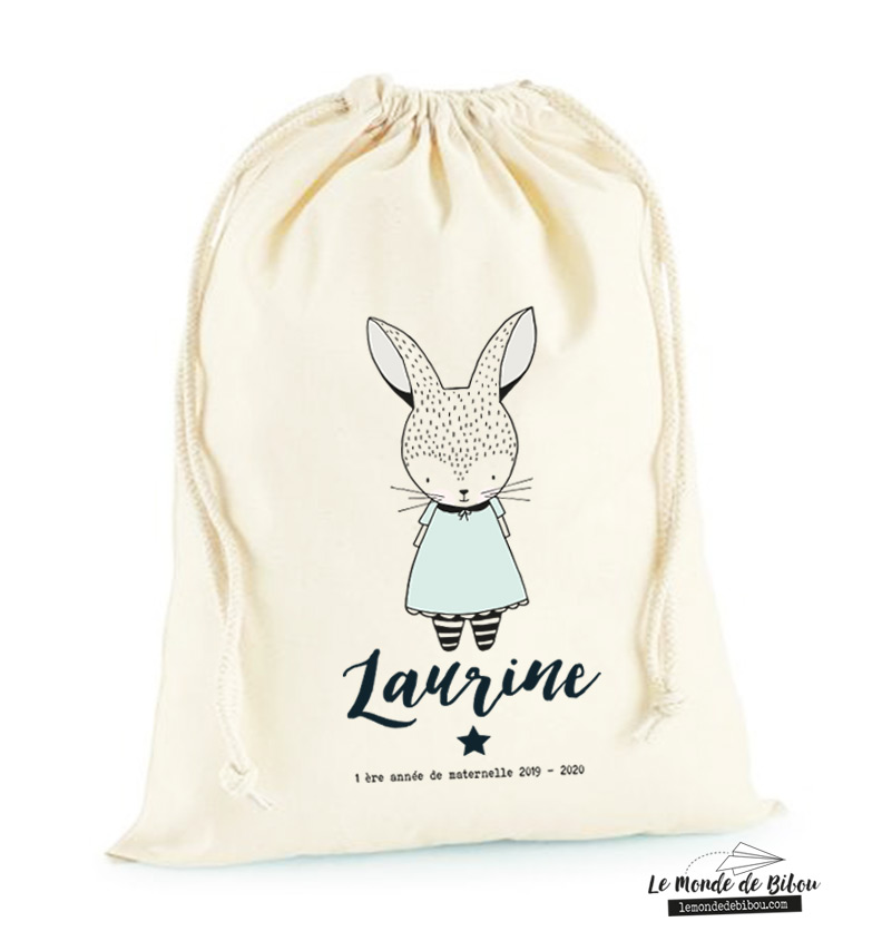 Un petit Sac de rangement Lapin personnalisable multi-usage. Il servira pour la crèche, l’école maternelle, pour transporter ses affaires chez les copains ou pour partir en week-end chez papy et mamie… Faîtes-en ce que vous voulez : un sac à pyjama, à goûter, à doudou, à change ou pour ranger ses petits jouets…