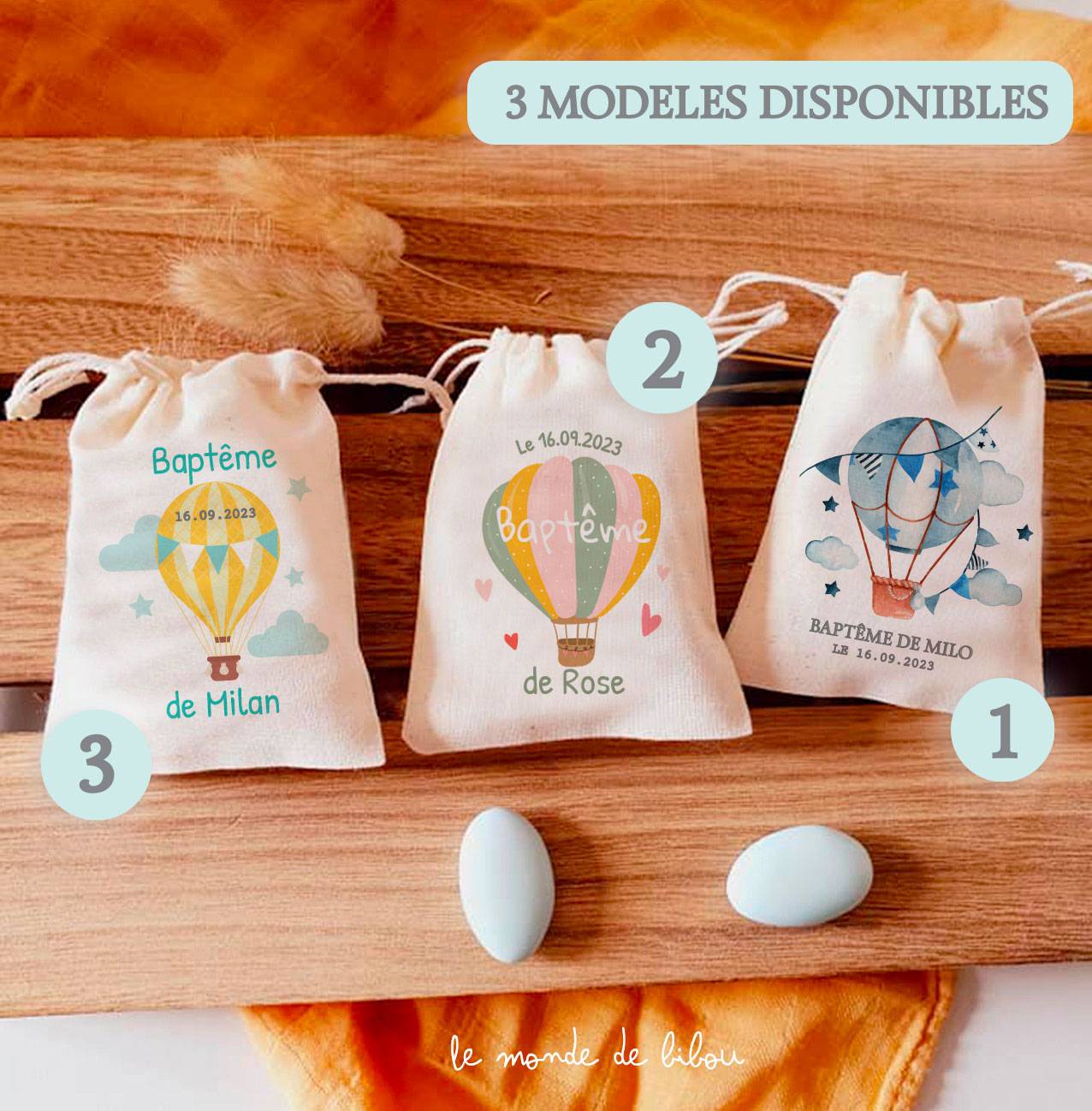 Ce ravissant petit Sac dragées personnalisé Montgolfière est personnalisable avec le prénom de l’enfant et la date de l’évènement. Le cadeau idéal à offrir à vos invités lors de votre évènement, que ce soit un Baptême, une Communion ou un anniversaire.