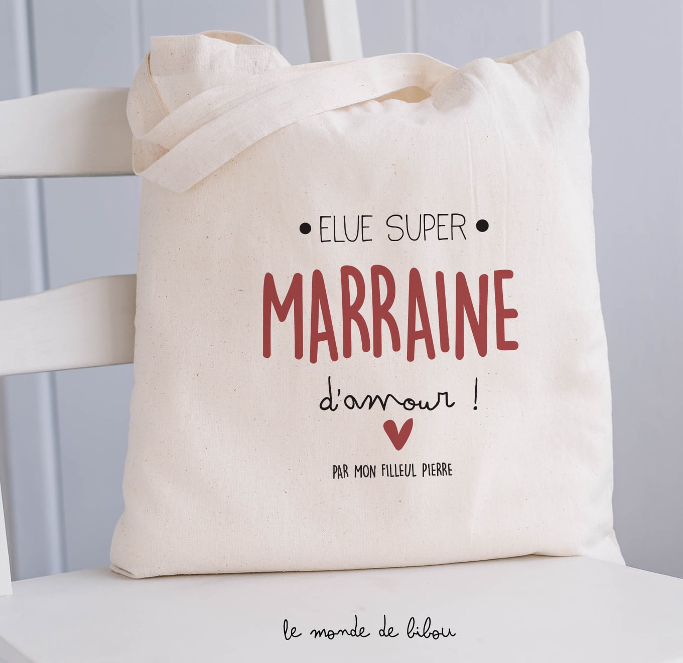 - Texte du sac : “Elue super marraine d’alour – par mon/ma filleule(e) Prénom du ou de la filleul(e)”