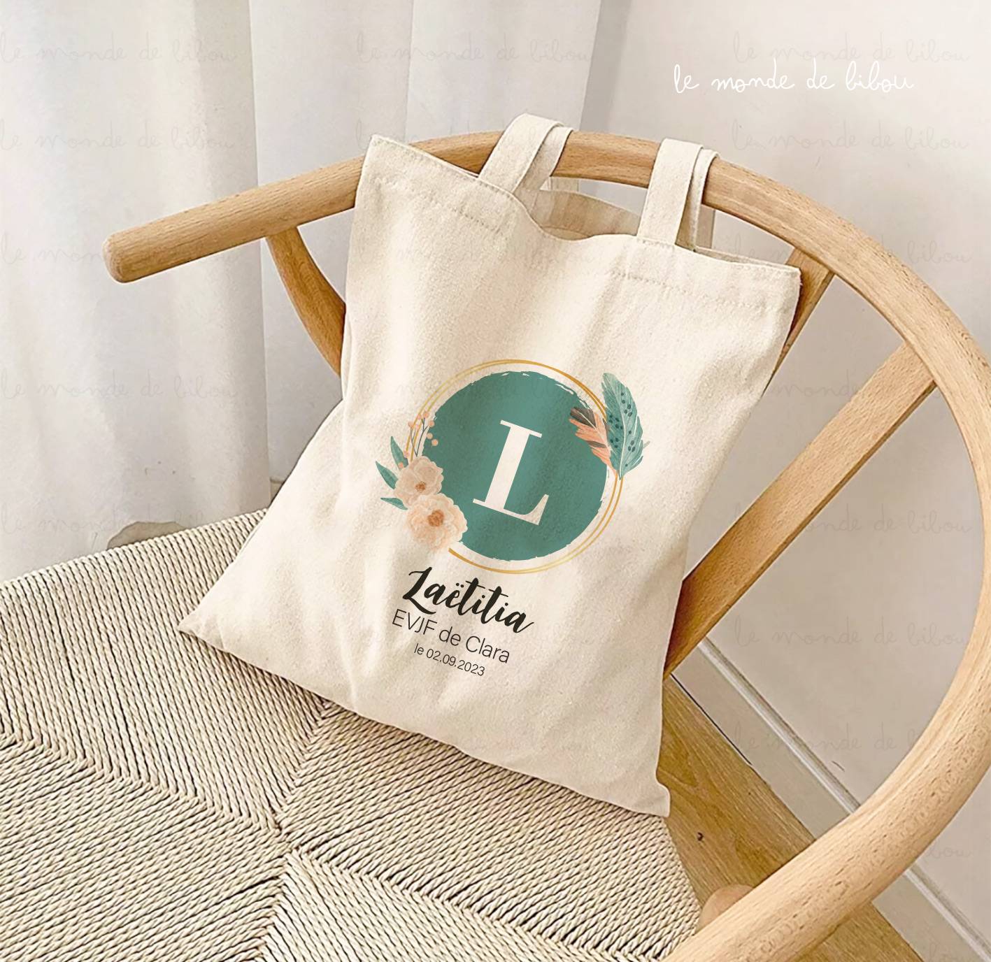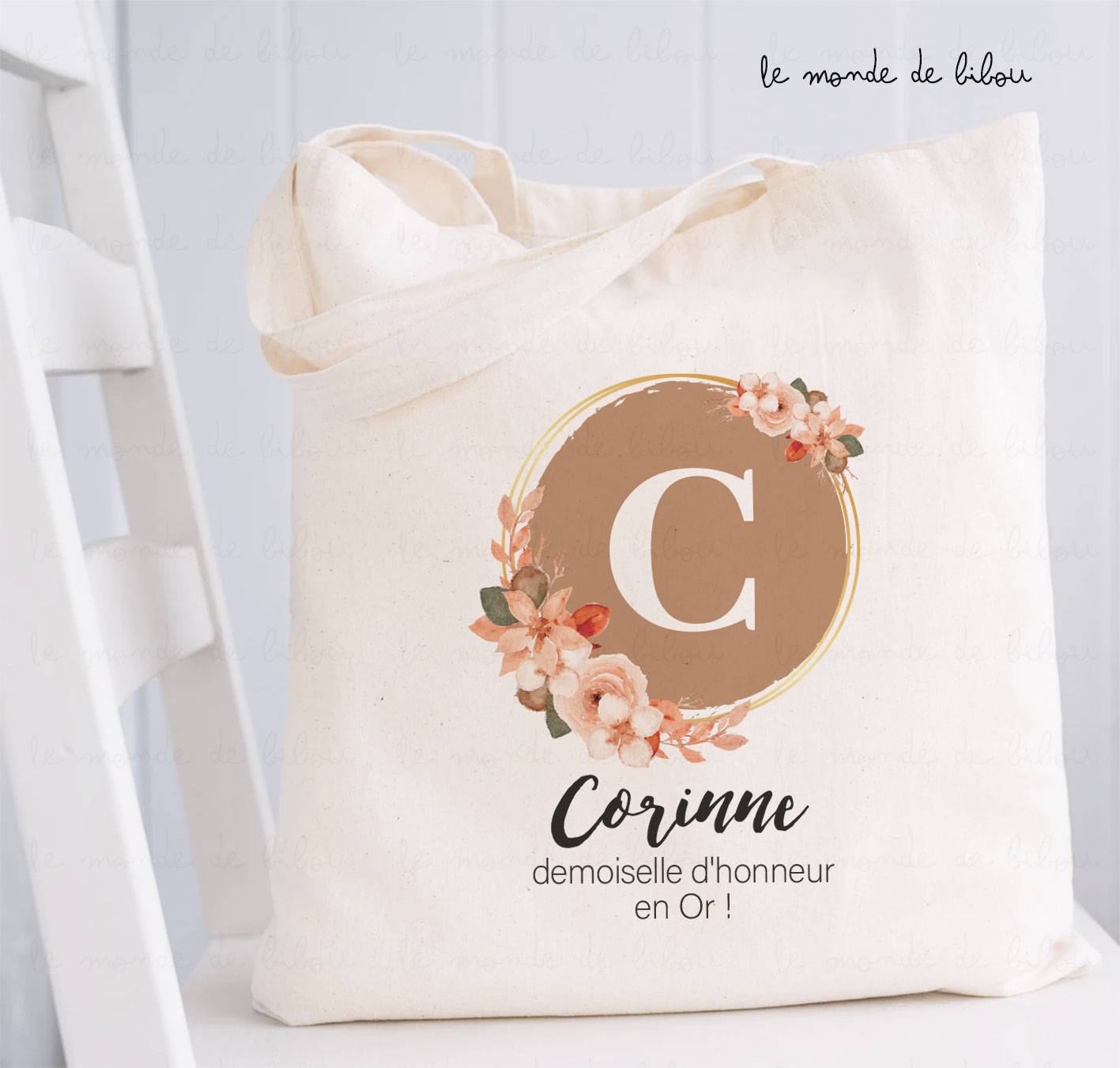 Nous vous proposons une trousse et un sac tote bag assortis sur le thème couronne de fleurs et initiale.