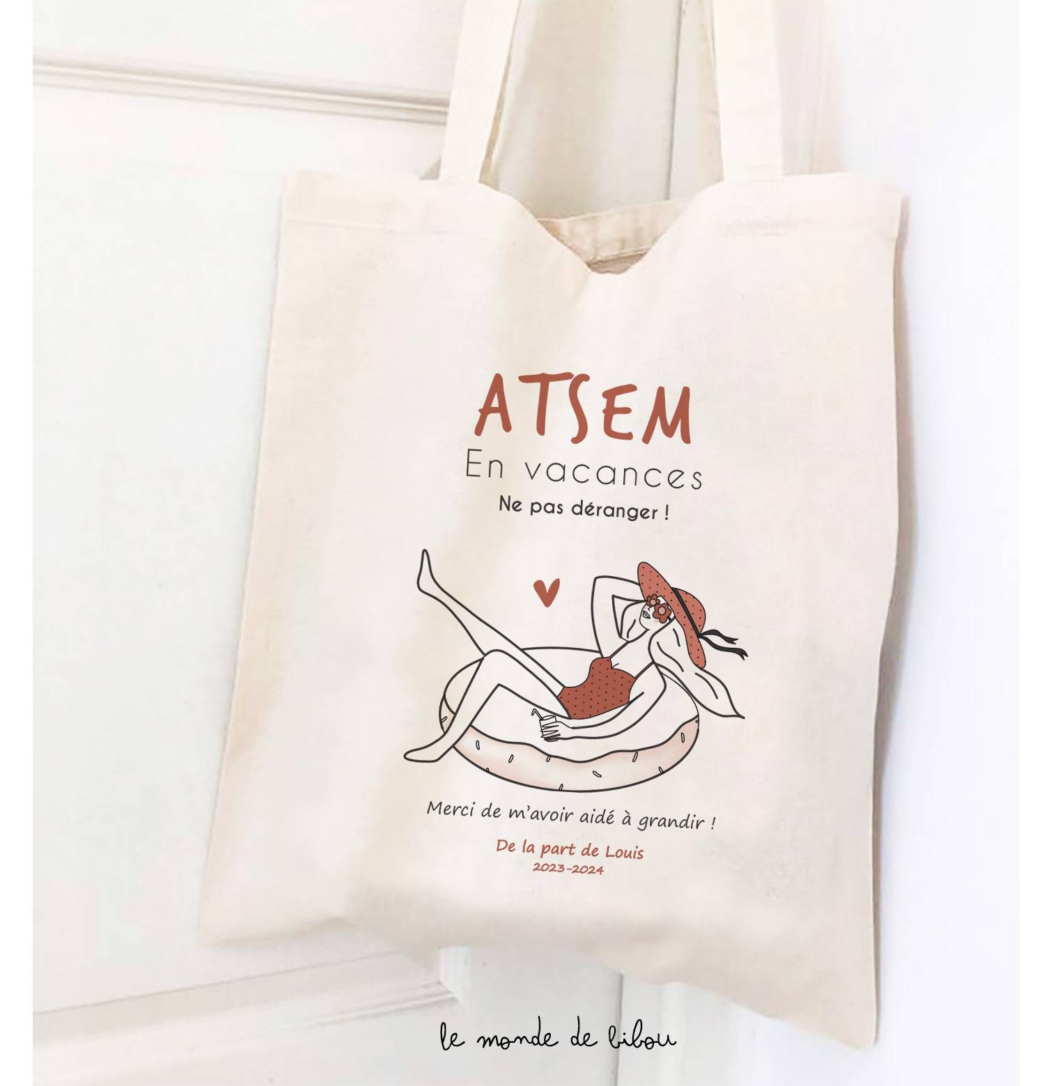 Notre tote bag maitresse en vacances ne pas déranger vous plaît ? Découvrez tous nos cadeaux pour les nounous, les maîtresses ou les Atsem (mugs, sacs, goodies et cartes) dans la boutique.