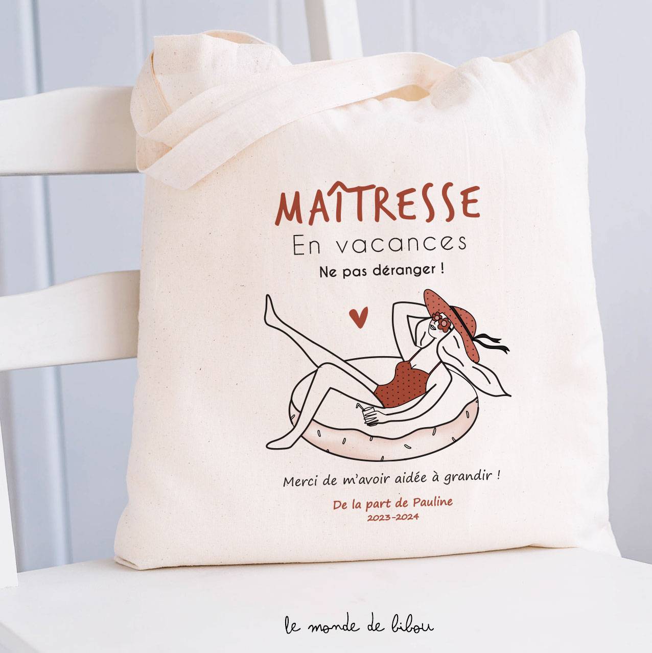 Vous souhaitez offrir un petit cadeau aussi joli qu’utile à la maîtresse de votre enfant ? Nous vous proposons ce joli Sac Maîtresse en vacances. On adore ce petit sac tote bag multi-usage, il servira aussi bien de sac de plage maitresse en vacances, ou pour aller à la salle de gym, mais aussi pour amener ses petites affaires au travail… On l’adore ce joli cadeau maitresse personnalisé pour l’enseignante de votre enfant ! Idéal à l’occasion d’un anniversaire ou comme cadeau de fin d’année scolaire…