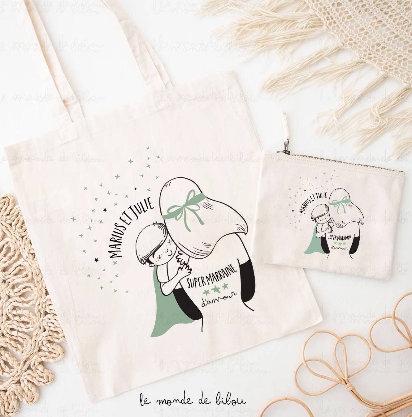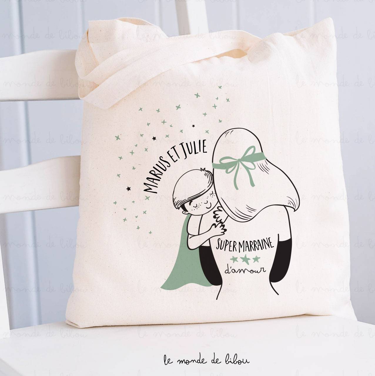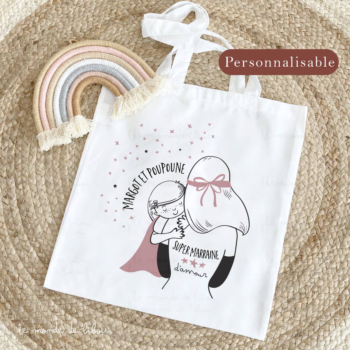 On adore ce super tote bag pour une Super Marraine, un cadeau marraine personnalisable à son prénom au style à la fois très tendance et rigolo.