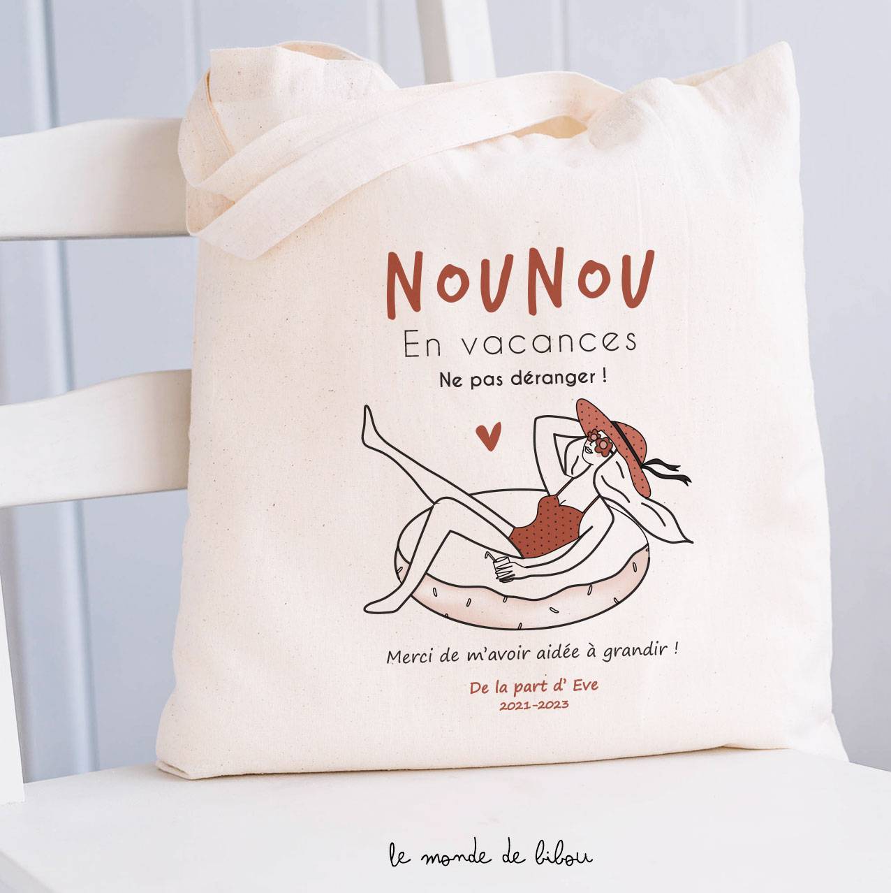 Vous souhaitez offrir un petit cadeau aussi joli qu’utile à la nounou de votre enfant ? Nous vous proposons ce joli Sac Nounou en vacances. On adore ce tote bag nounou en vacances multi-usage, il servira aussi bien pour faire les courses, aller à la salle de gym, que pour amener ses petites affaires au travail… On l’adore ce joli cadeau nounou personnalisé pour l’assistante maternelle de votre enfant ! Idéal à l’occasion d’un anniversaire ou comme cadeau de fin d’année scolaire…