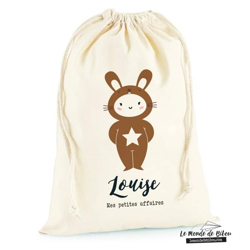Un petit Sac rangement Mon petit lapin personnalisable multi-usage, il servira pour la crèche, l’école maternelle, pour transporter ses affaires chez les copains ou pour partir en week-end chez papy et mamie… Tout est possible puisque c’est vous qui choisissez la phrase de personnalisation ! Faîtes-en ce que vous voulez : un sac à pyjama, à goûter, à doudou, à chaussons, à change ou pour ranger ses petits jouets…