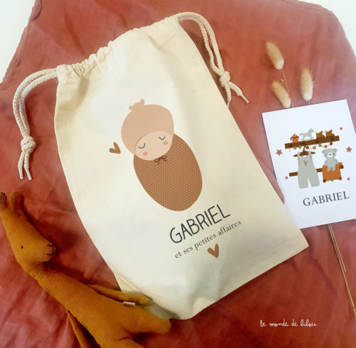 Un petit Sac rangement personnalisé Bébé multi-usage, idéal pour transporter les affaires de bébé. Faîtes-en ce que vous voulez : un sac à pyjama, à doudou, à chaussons, à change ou pour ranger ses petits jouets… C’est aussi une belle idée de cadeau de naissance personnalisé.