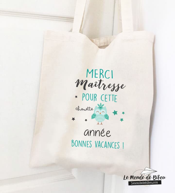 Vous souhaitez offrir un petit cadeau aussi joli qu’utile à la maîtresse de votre enfant ? Nous vous proposons ce joli Sac remerciement Chouette Maîtresse. On adore ce petit sac tote bag multi-usage, il servira aussi bien pour faire les courses, aller à la salle de gym, que pour amener ses petites affaires au travail… On l’adore ce joli cadeau pour l’enseignante de votre enfant ! Idéal à l’occasion d’un anniversaire, comme cadeau de Noël ou comme cadeau de fin d’année scolaire…