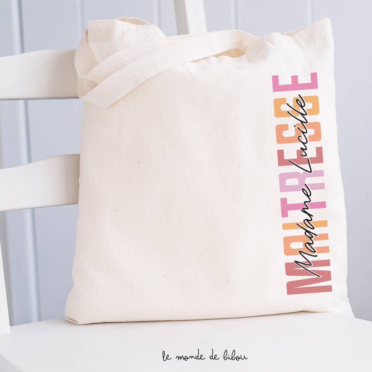 Ce Sac Tote bag personnalisé maîtresse prénom est une chouette idée de cadeau à offrir à une super maîtresse ou encore un maître. Exprimez votre gratitude envers votre enseignante avec ce magnifique tote bag personnalisé. Ce sac est le cadeau idéal, à la fois pratique et durable. De plus, il est personnalisable au prénom de l’enseignant(e) ce qui en fait un cadeau unique ! Parfait comme cadeau de fin d’année scolaire ou pour toute occasion spéciale. C’est une belle attention pour dire merci.