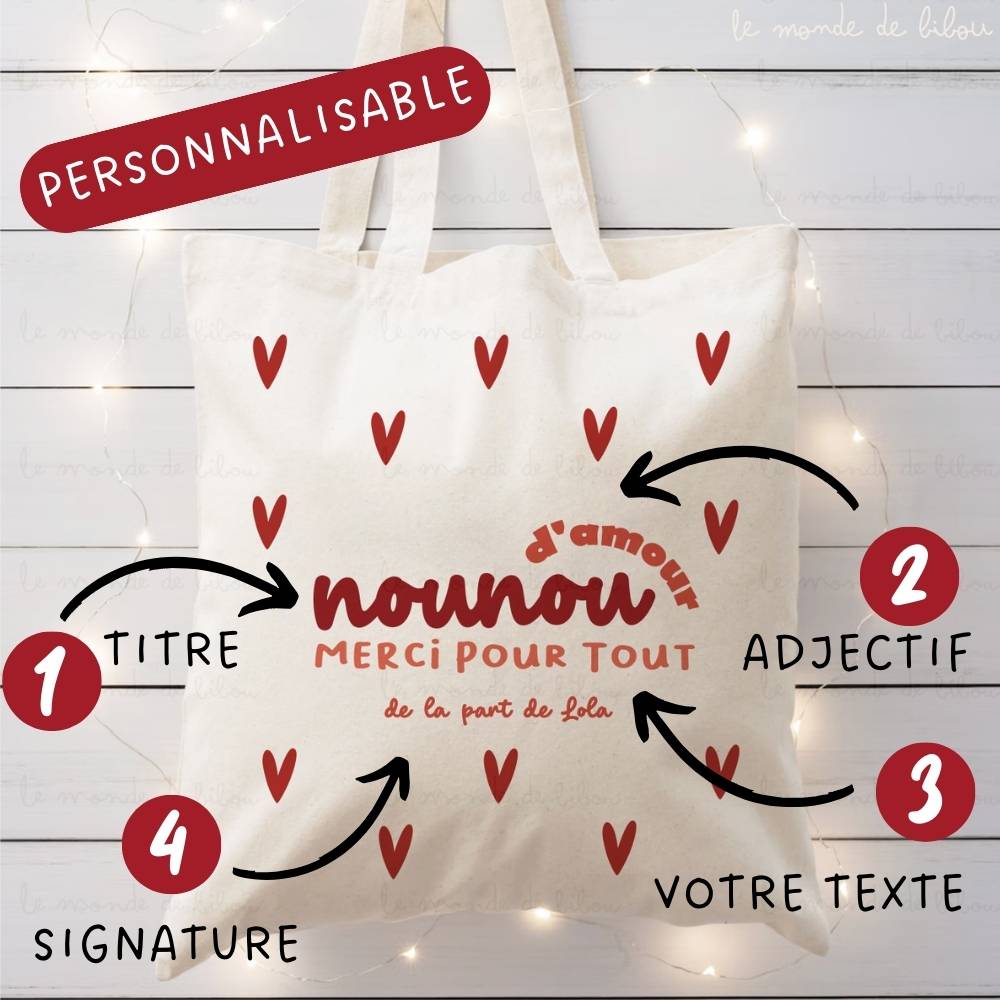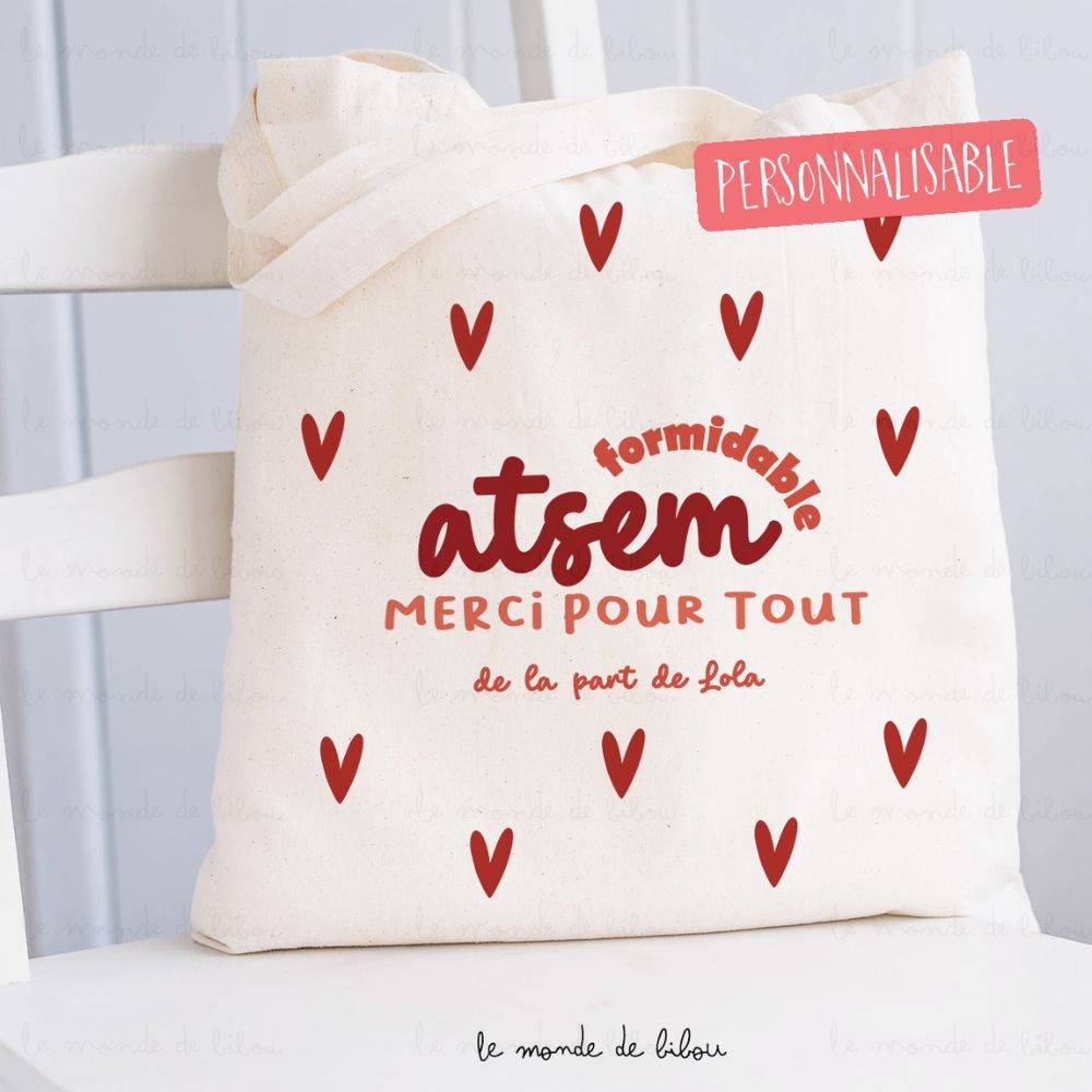 Notre Sac Tote bag personnalisé motif cœur vous plaît ? Découvrez tous nos cadeaux pour les nounous, les maîtresses ou les Atsem (mugs, sacs, goodies et cartes) dans la boutique.