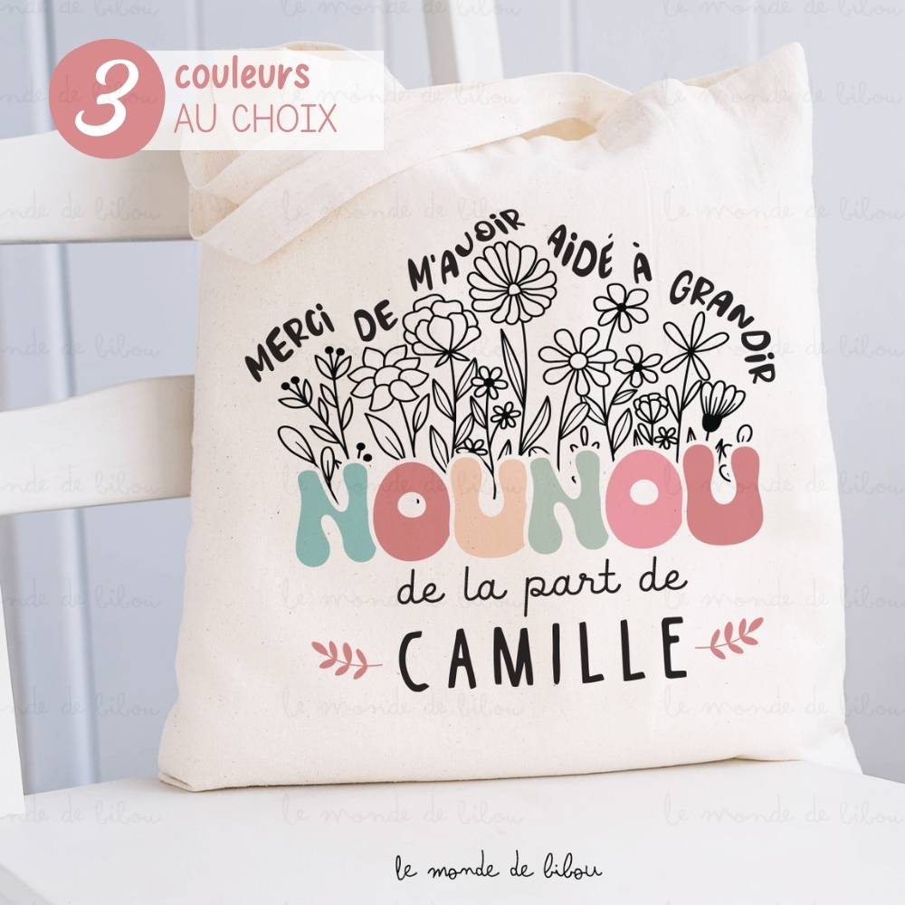 Ce Sac Tote bag personnalisé remerciements nounou est une chouette idée de cadeau à offrir à une super nounou, une maîtresse, une animatrice … Exprimez votre gratitude envers votre nounou avec ce magnifique tote bag personnalisé. Ce sac est le cadeau idéal, à la fois pratique et durable. La phrase « Merci de m’avoir aidé à grandir Nounou » est imprimée avec soin sur le devant, témoignant de votre appréciation sincère pour tout ce qu’elle a fait. Parfait comme cadeau à offrir pour toute occasion spéciale. C’est une belle attention pour remercier toutes les personnes qui s’occupent de votre enfant. Elles méritent donc toutes un petit cadeau, une petite attention qui fera forcément plaisir à recevoir comme notre sac tote bag personnalisable.