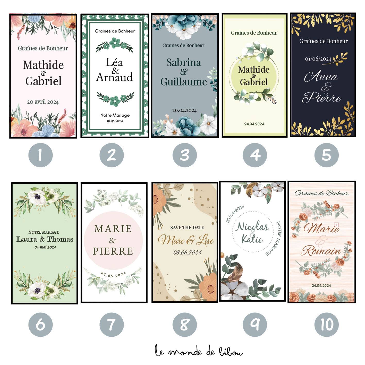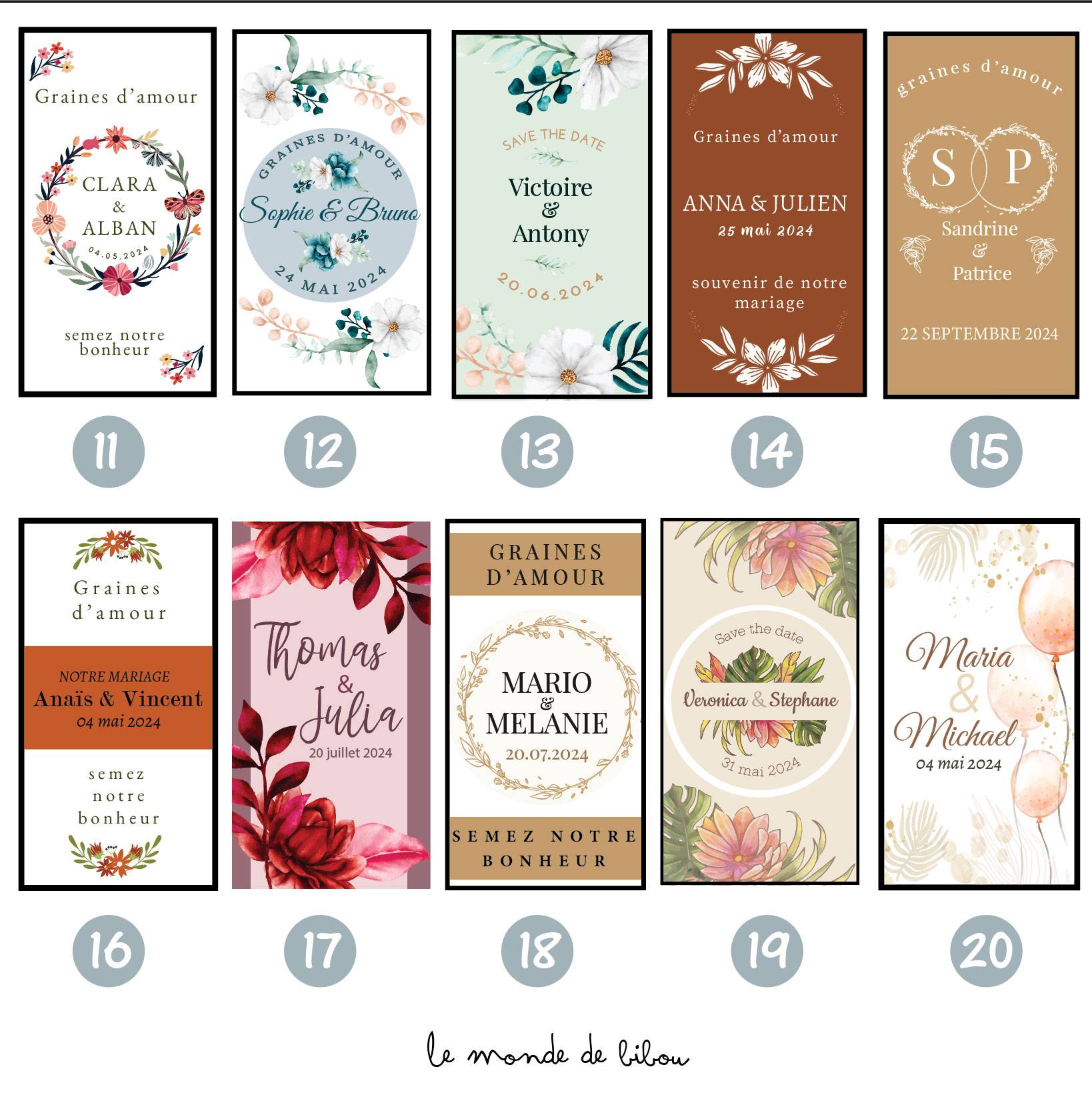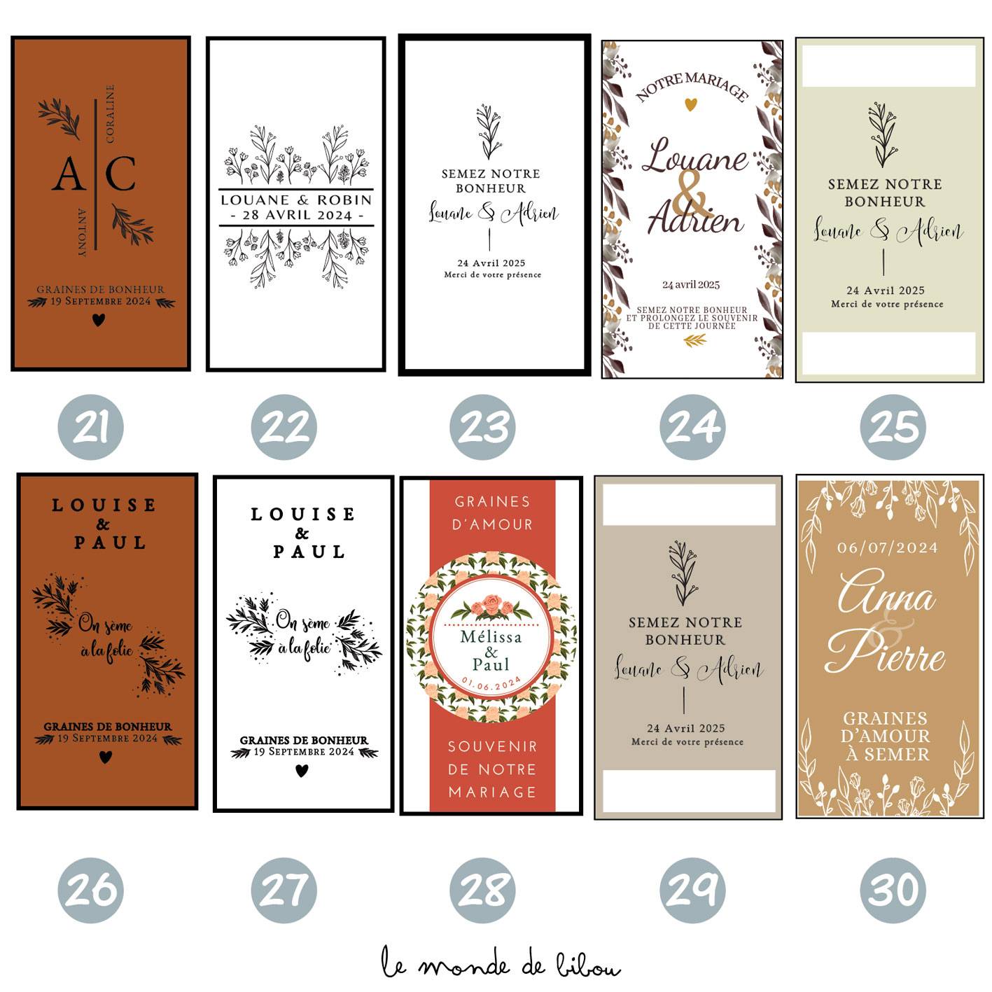Ajoutez une touche personnelle à votre mariage en personnalisant les sachets avec vos prénoms et la date de votre union. 30 modèles sont disponibles ! Vous n’avez pas trouvé votre thème de mariage dans nos illustrations ? Contactez nous pour un sachet de graines à planter personnalisé sur-mesure.