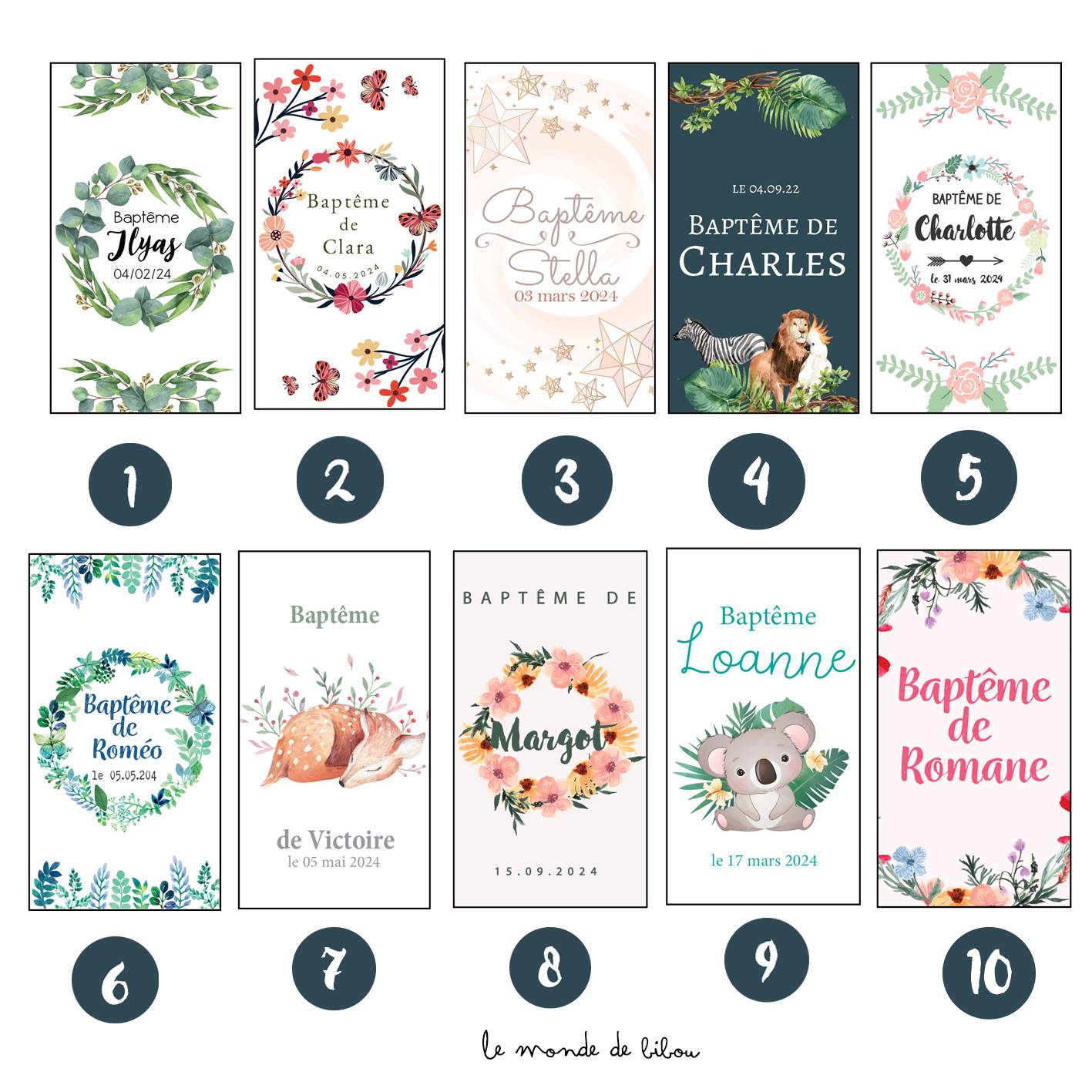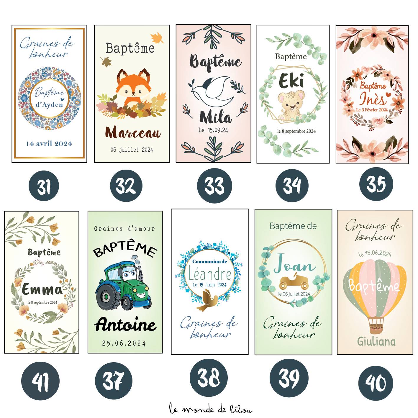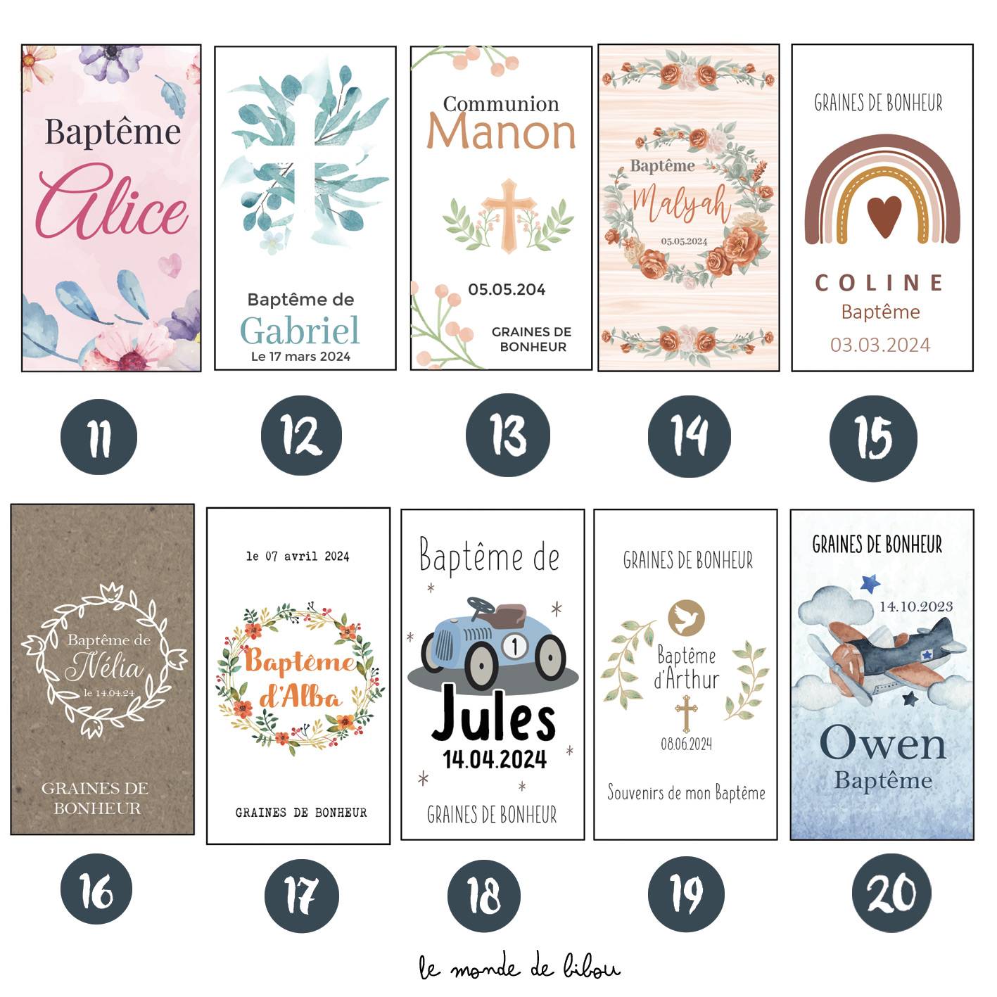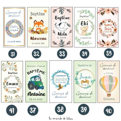 Ajoutez une touche personnelle à votre événement en personnalisant les sachets avec le prénom de l’enfant, la nature de l’évènement comme un Baptême ou une Communion et la date de la célébration. 41 modèles sont disponibles ! Vous n’avez pas trouvé votre thème dans nos illustrations ? Contactez nous pour un sachet de graines à planter personnalisé sur-mesure.