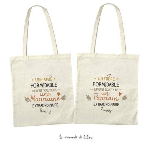 Nos Sacs Parrain Marraine extraordinaire existent en version solo Parrain et Marraine. Retrouvez tous nos sacs tote bags Parrain et Marraine sur la boutique ainsi que nos cadeaux Parrain/Marraine (Badges, Magnets, Kits cadeaux, Demandes parrain marraine, Sacs et Pochettes…).