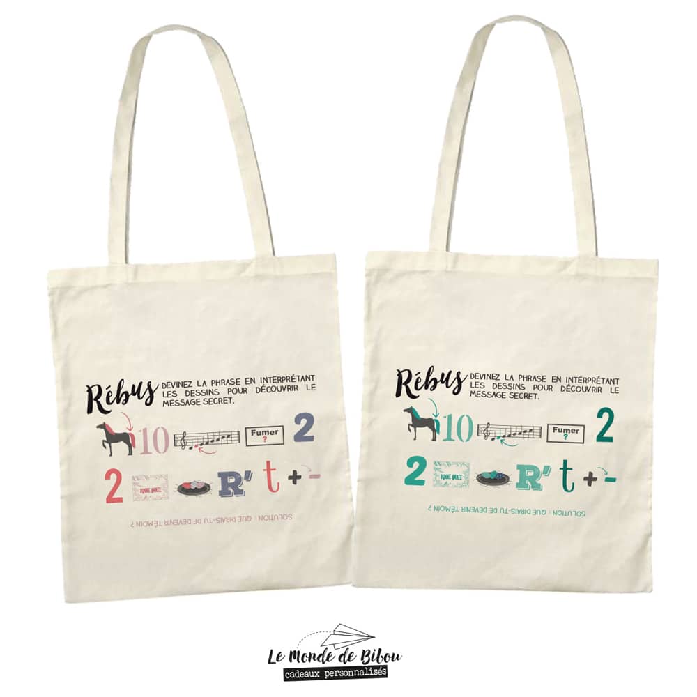 Vous souhaitez faire une demande témoin originale ? Voici deux jolis Sacs rébus demande Témoins à offrir pour faire votre demande à vos futurs témoins de mariage. Le Tote Bag est en coton de très bonne qualité, c’est un souvenir aussi joli qu’utile, à emmener partout. Il peut servir pour de multi-usages ou pourquoi pas comme sac pour les courses ou sac de plage. Mais il peut aussi servir de sac de sport ou de sac fourre-tout… C’est une surprise qui fera plaisir à coup sûr, une demande dont on se souviendra longtemps.