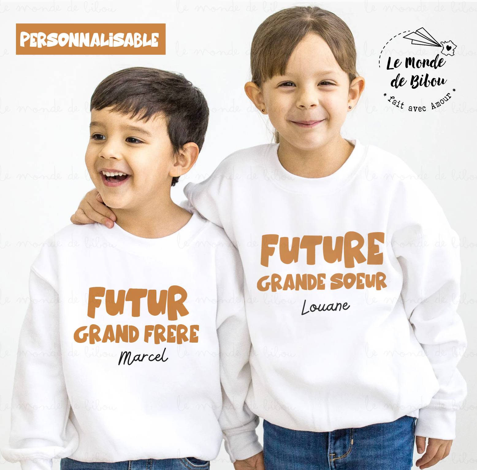 Ce sweat futur(e) frère sœur personnalisé  pour enfant est l’idée parfaite pour célébrer et annoncer à tout l’entourage l’arrivée d’un futur bébé dans la famille ! Fabriqué dans une matière douce et confortable, ce sweat est disponible uniquement en blanc et peut être personnalisé avec les mentions « future grande sœur » ou « futur grand frère », suivies du prénom de votre enfant. La personnalisation, imprimée en caramel, apporte une touche unique et adorable qui fera fondre toute la famille.