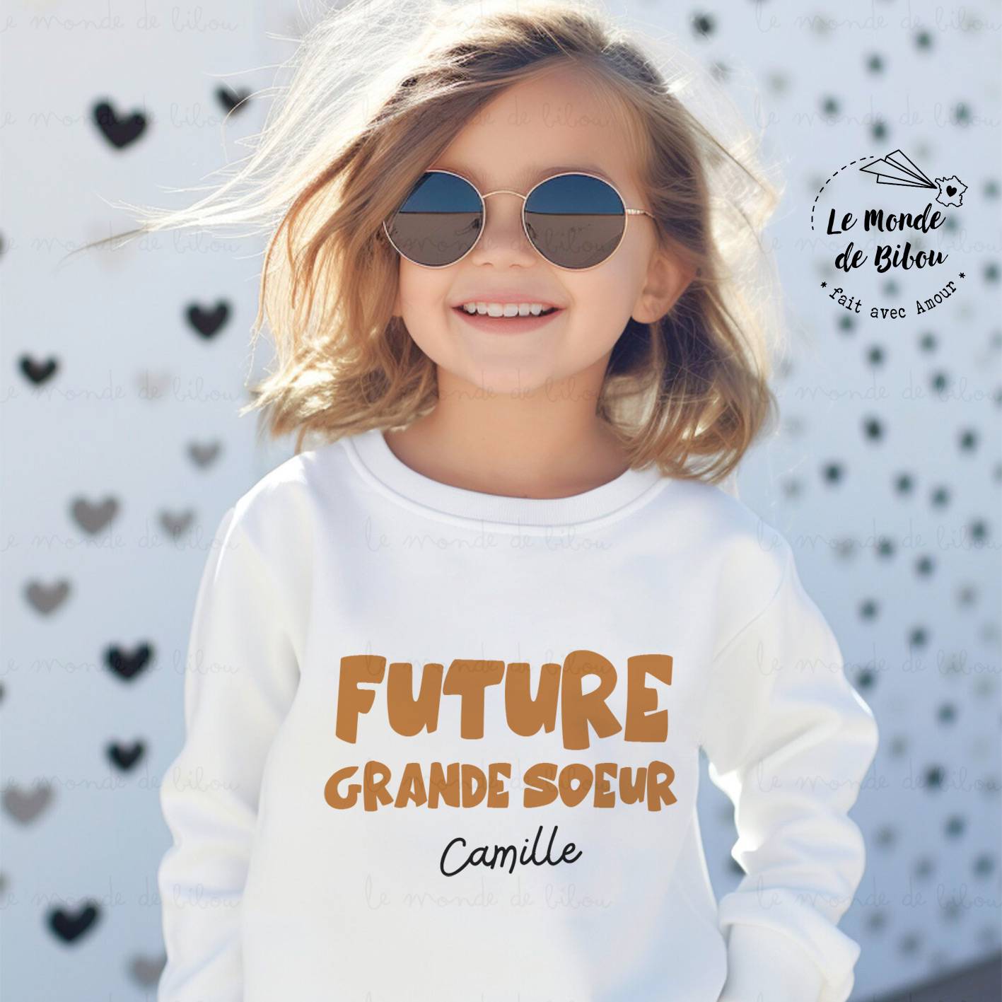 Personnalisez ce sweat blanc pour votre enfant avec ‘future grande sœur’ ou ‘futur grand frère’ + son prénom, c’une belle façon d’annoncer l’arrivée d’un bébé à tous votre entourage.
