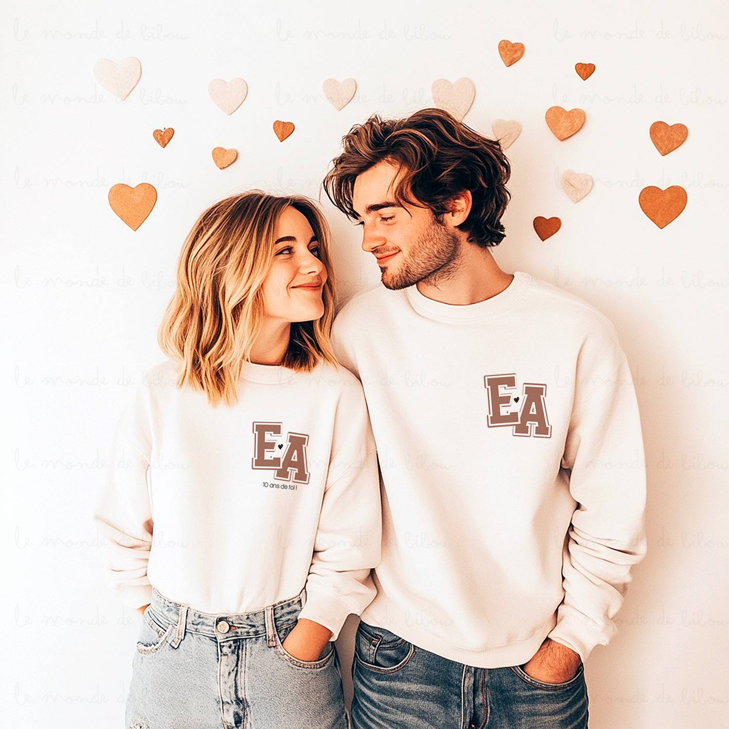 Vous cherchez un cadeau original et significatif pour la Saint Valentin ? Nos sweats personnalisés avec les initiales d’un couple sont l’option idéale ! Conçus pour être portés en duo, ces sweats blancs disponibles pour hommes et femmes offrent un look matchy-matchy irrésistible. Avec des tailles allant du S au 2XL, chacun trouvera son bonheur.