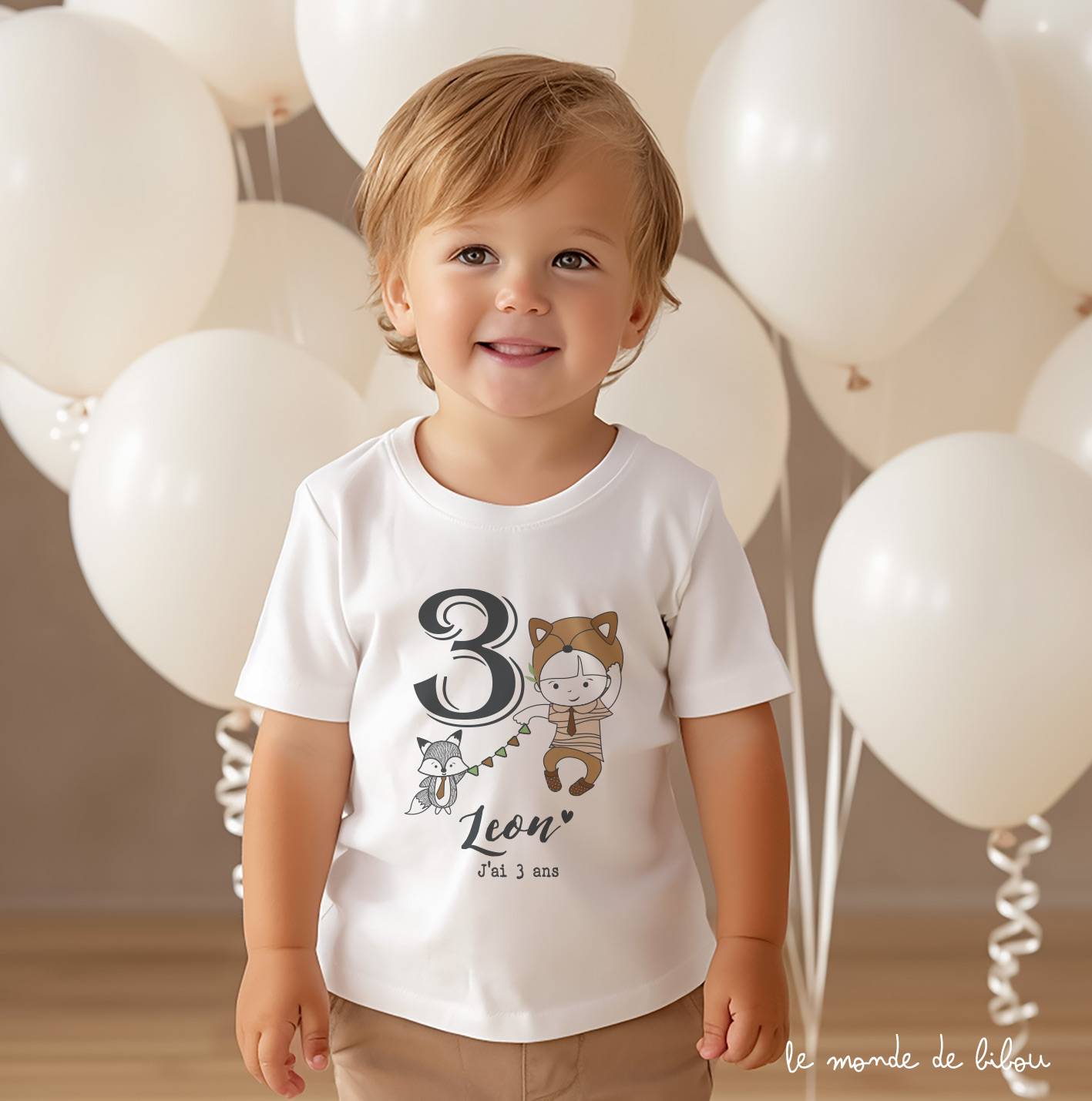 Un joli T-shirt anniversaire garçon personnalisé pour fêter son anniversaire, idéal pour faire de jolies photos souvenirs. Le t-shirt est personnalisé avec l’âge et le prénom de l’enfant. Nous vous le proposons en plusieurs tailles du 3 mois au 13 ans ! une illustration unique, réalisée dans notre atelier avec amour !