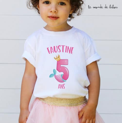 Un joli T-shirt anniversaire Sirène personnalisé pour fêter son anniversaire, idéal pour faire de jolies photos souvenirs. Le t-shirt est personnalisé avec l’âge et au prénom de l’enfant. Nous vous le proposons en plusieurs tailles du 3 mois au 14 ans !
