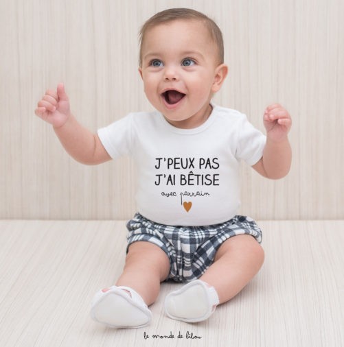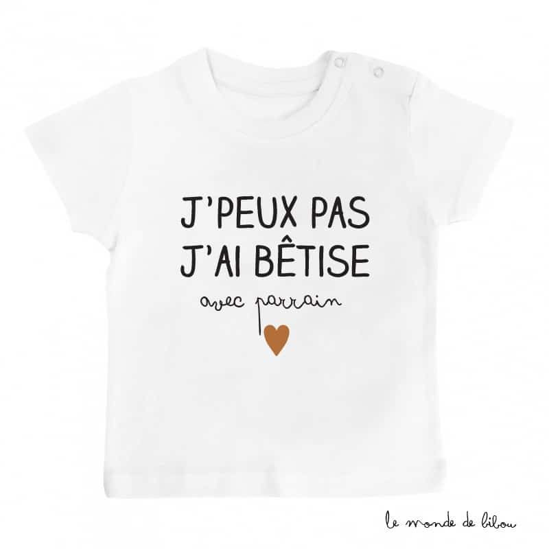 On adore ce petit T-shirt Bêtise avec Parrain. Ce t-shirt manches courtes ou longues convient à tous les bébés de 6 mois à 2 ans, la fermeture à l’épaule se fait par pression pour faciliter le changement.