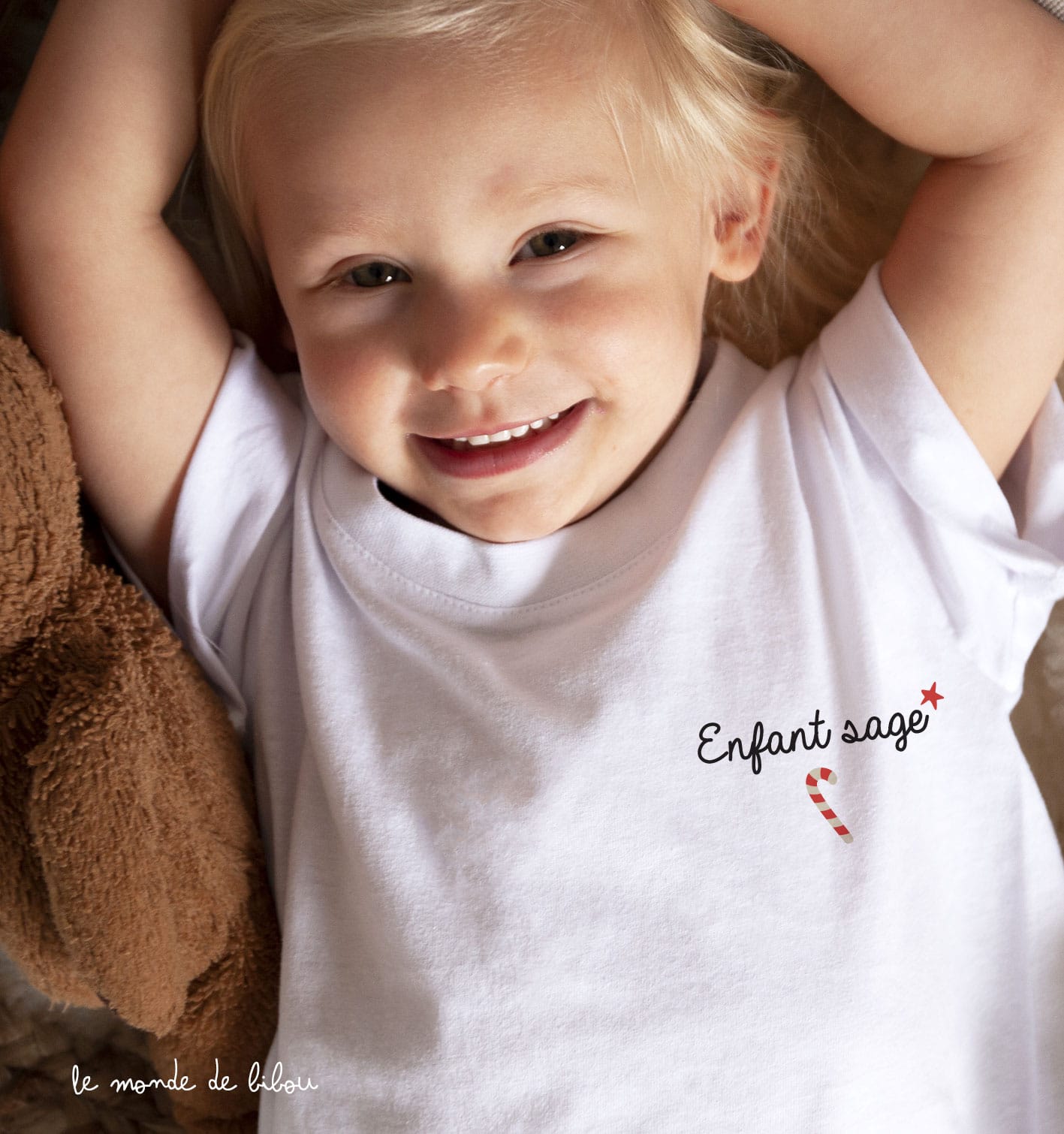 Vous cherchez un cadeau souvenir pour le Noël de votre enfant ? Ne cherchez plus, notre t-shirt est le cadeau idéal à offrir à l’occasion de vos fêtes de fin d’année. On adore ce T-Shirt de Noël Enfant sage ! Ce t-shirt manches courtes qui convient à tous les enfants de 3 mois à 14 ans (2 modèles différents selon l’âge).