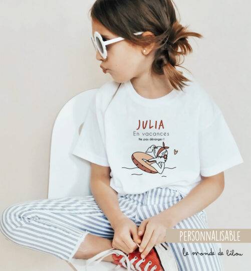 On adore ce T-Shirt Enfant en vacances personnalisé ! Un joli t-shirt manches courtes qui convient à tous les enfants de de 3 à 13 ans. Notre t-shirt personnalisé à son prénom est idéal pour votre enfant fille ou garçon.