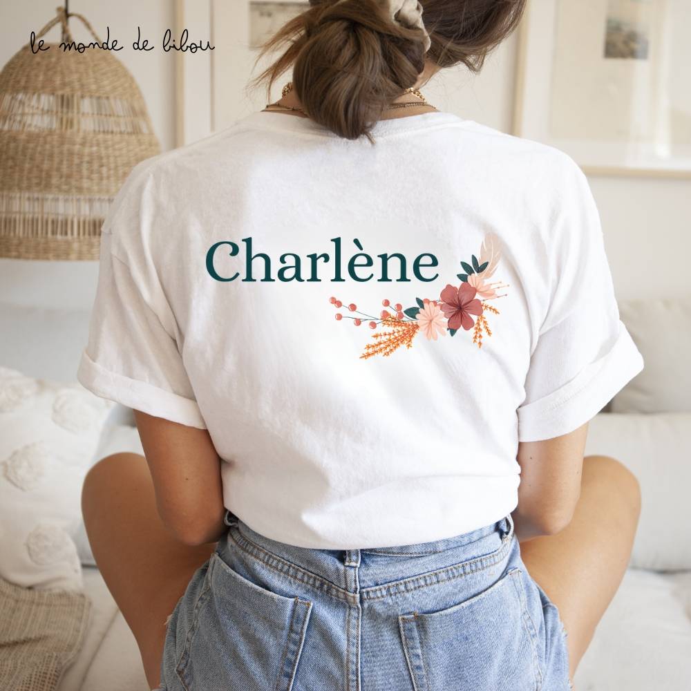 Célébrez l’enterrement de vie de jeune fille avec style grâce à notre T-shirt enterrement vie jeune fille Bride prénom qui est le cadeau parfait à offrir aux participantes d’un EVJF ! La team de la mariée sera réunie pour former une véritable équipe autour de la future mariée. Vous avez la possibilité de personnaliser ce T-shirt comme vous le souhaité. Ce t-shirt est imprimé en recto verso pour une apparence saisissante. À l’avant, une magnifique couronne florale avec les informations concernant L’EVJF en question. Au dos, le prénom de la participante à l’EVJF, ce qui ajoutera une touche personnelle à cette journée inoubliable. Comme par exemple :demoiselle d’honneur – Léna … Team mariée ou encore témoin de la mariée … Vous créez votre t-shirt personnalisé EVJF !