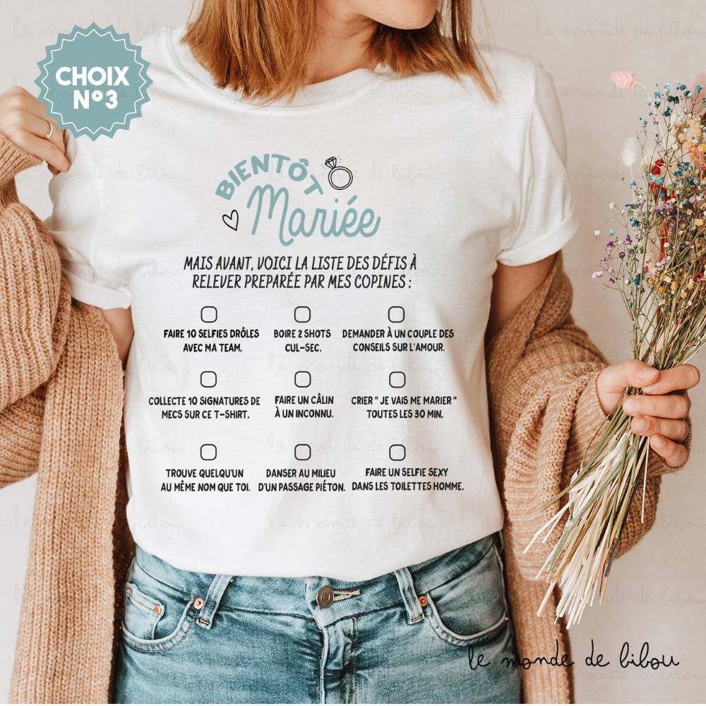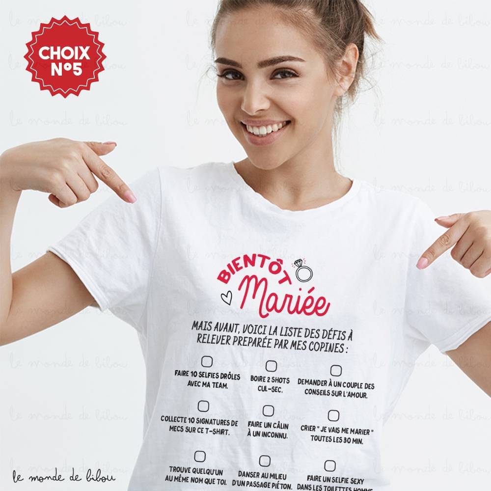 Célébrez l’enterrement de vie de jeune fille avec style grâce à notre T-shirt enterrement vie jeune fille Défi  qui est le cadeau parfait à offrir pour un EVJF ! Ce t-shirt est l’accessoire ultime pour un enterrement de vie de jeune fille rempli de défis et de fous rires.  Il est 100% personnalisable car c’est la team de la mariée qui doit choisir les défis que la mariée doit réaliser. En effet, ce t-shirt permettra à la future mariée de se lancer dans une aventure inoubliable, orchestrée par ses amies les plus proches.