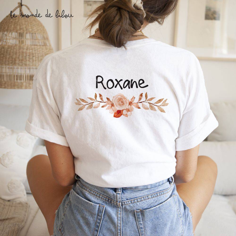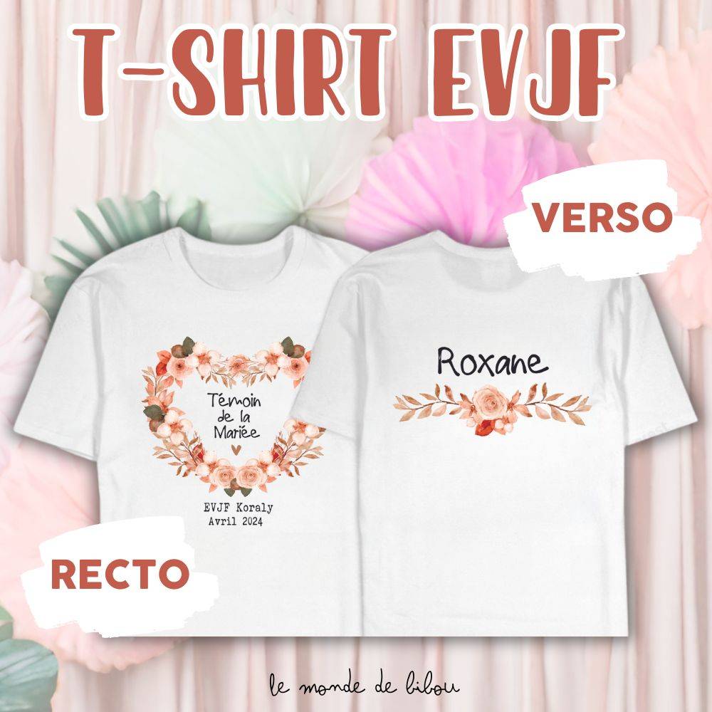 Célébrez l’enterrement de vie de jeune fille avec style grâce à notre  T-shirt evjf coeur terracotta prénom qui est le cadeau parfait à offrir aux participantes d’un EVJF ! La team de la mariée sera réunie pour former une véritable équipe autour de la future mariée. Vous avez la possibilité de personnaliser ce T-shirt  comme vous le souhaité. Ce t-shirt est imprimé en recto verso pour une apparence saisissante. À l’avant, une magnifique couronne florale  avec les informations concernant L’EVJF en question. Au dos, le prénom de la participante à l’EVJF, ce qui ajoutera une touche personnelle à cette journée inoubliable. Comme par exemple :demoiselle d’honneur – Léna … Team mariée ou encore témoin de la mariée … Vous créez votre t-shirt personnalisé EVJF !