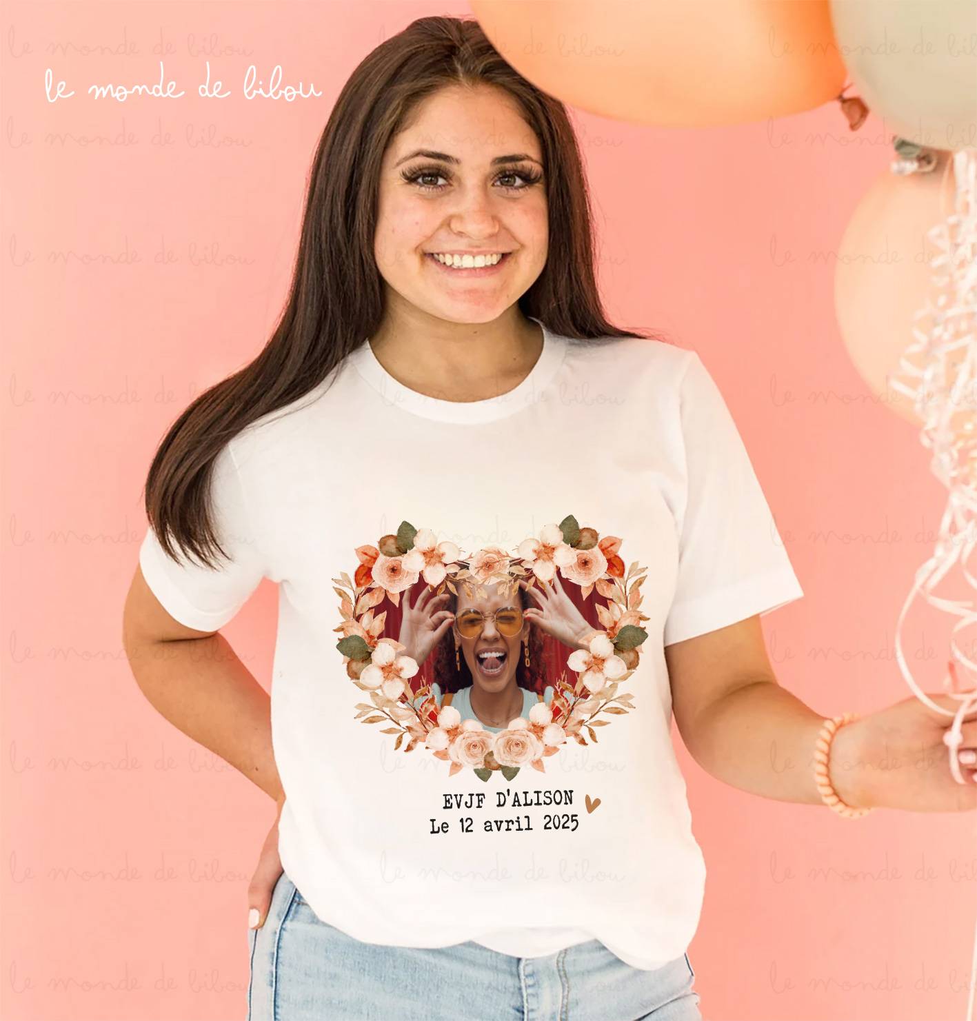 Ajoutez une touche d’émotion et de fun à votre Enterrement de Vie de Jeune Fille avec ce t-shirt personnalisé imprimé avec la photo de la future mariée dans un cœur. Un souvenir original et plein de tendresse pour marquer cette journée unique avec toute la team mariée.