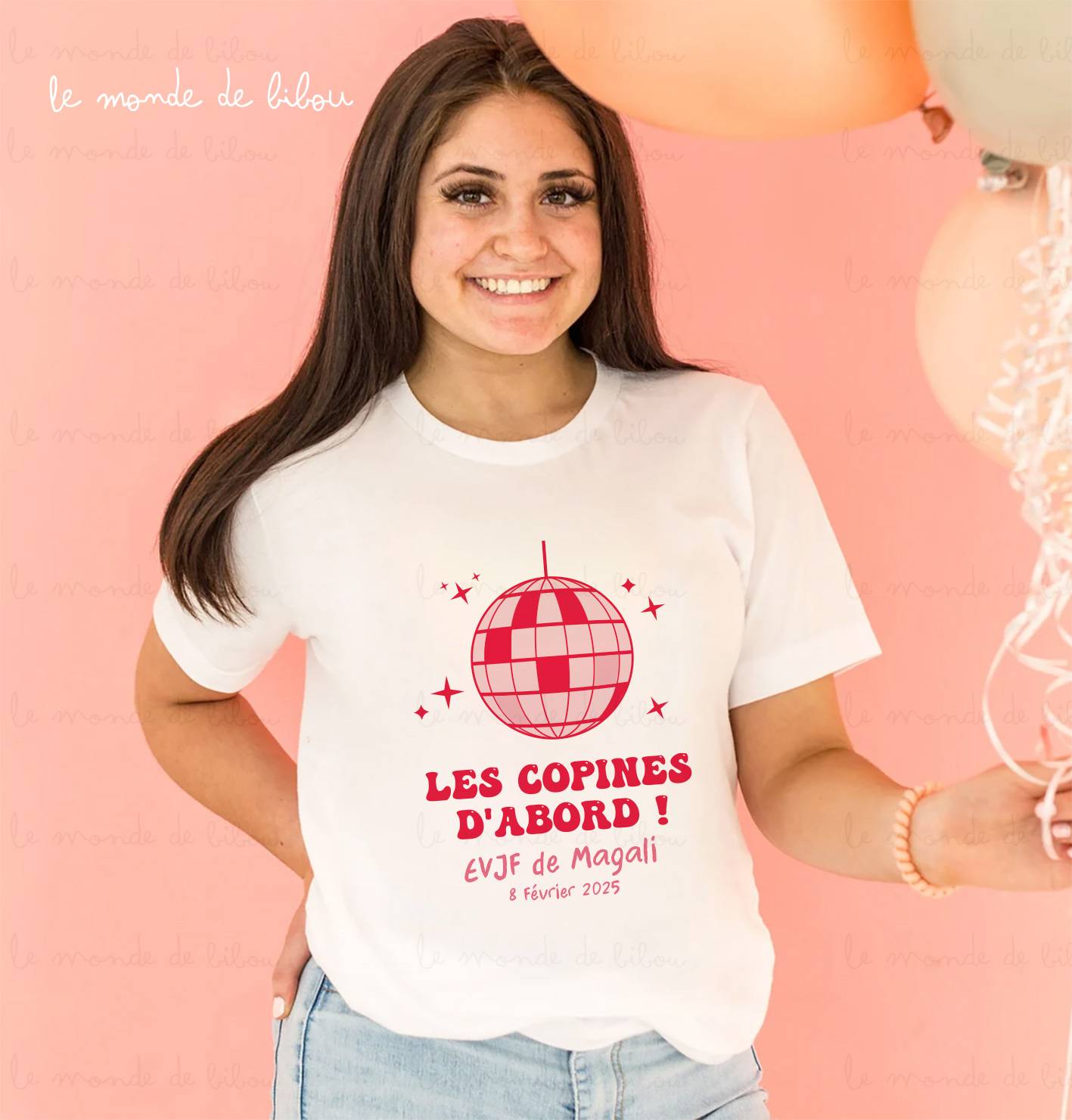 Nos jolis tee-shirts personnalisés EVJF enterrement de vie de jeune fille seront l’accessoire parfait pour une journée inoubliable et pour la réalisation de belles photos souvenirs . la future mariée ne pourra qu’être heureuse d’être entourée de sa team ! On adore l’illustration boule à facette réalisé dans notre atelier. Disponible en deux coloris rose ou bleu !