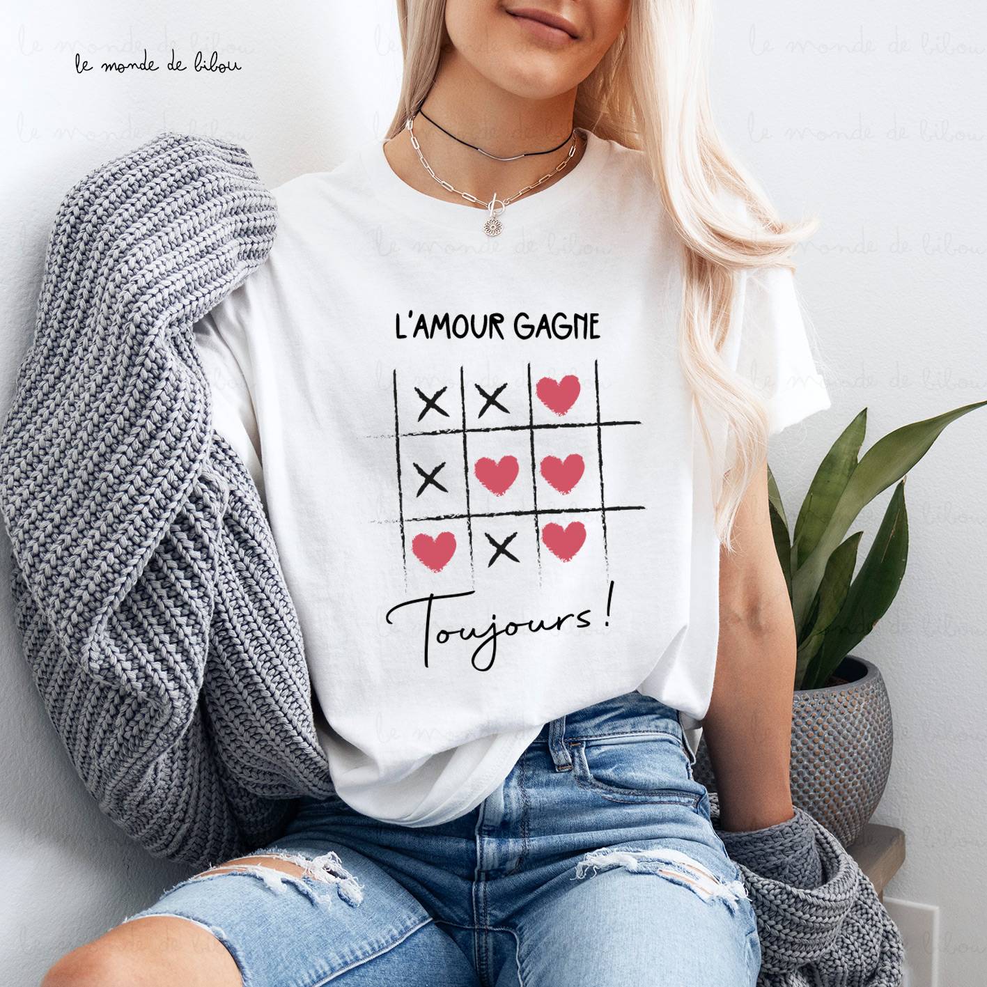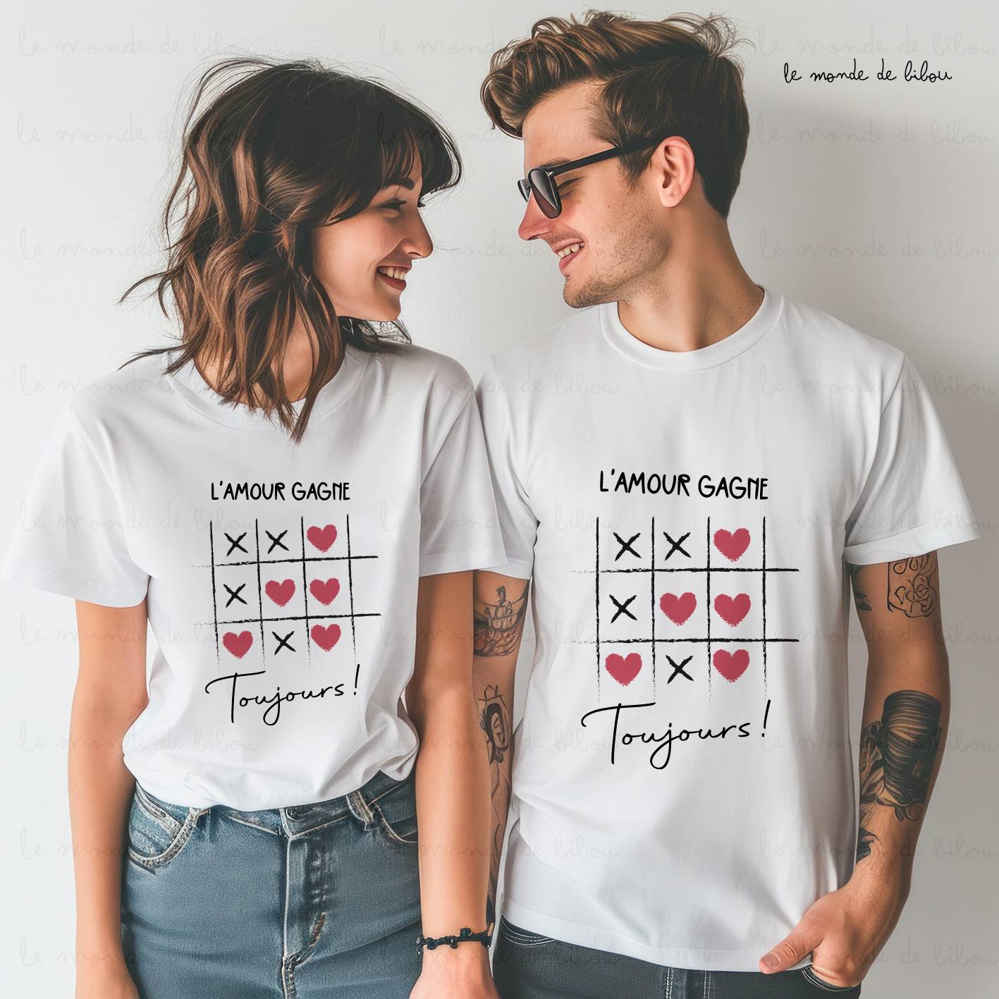 Exprimez votre amour avec style grâce à notre T-shirt « L’Amour Gagne Toujours » ! Disponible en version femme ou homme, ce t-shirt est idéal pour les couples souhaitant adopter un look assorti. Son motif tendre et ludique, inspiré du jeu du morpion avec des cœurs et des « X », rappelle que l’amour triomphe toujours. Que ce soit pour la Saint Valentin ou pour illuminer une journée ordinaire, ce t-shirt apportera une touche de bonne humeur à votre garde-robe.