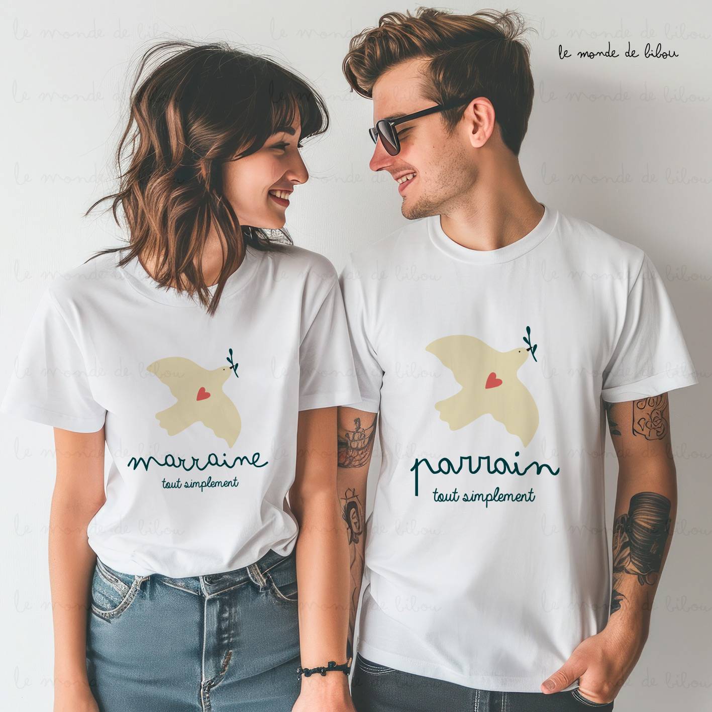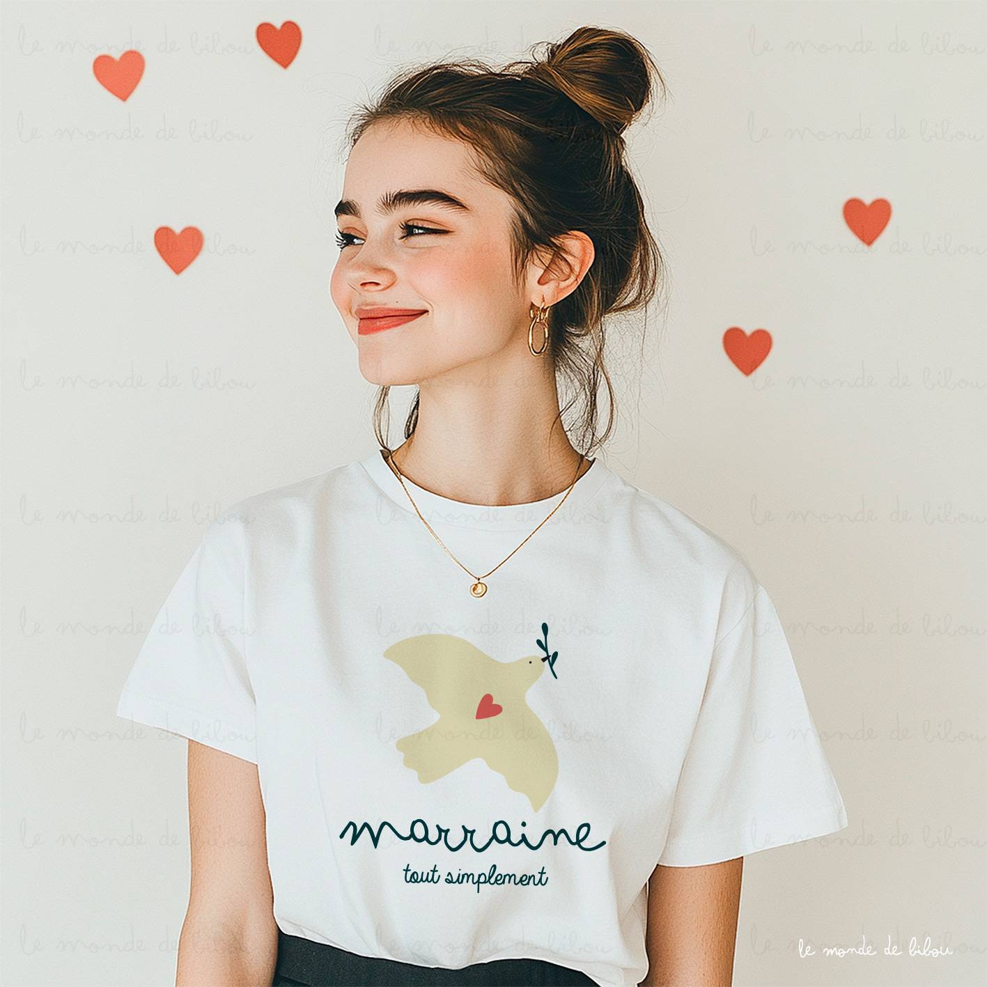 Le t-shirt « Marraine tout simplement » est orné d’une illustration délicate de colombe, symbolisant tendresse et sérénité.