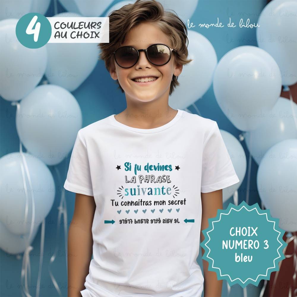 Le T-shirt personnalisé Devine mon secret est un vêtement adorable et significatif conçu pour annoncer joyeusement n’importe quelle belle nouvelle . Avec son message astucieux écrit à l’envers, ce t-shirt encourage les autres à deviner la phrase secrète pour révéler le message caché. Ainsi, vous pouvez utiliser ce t-shirt pour créer une énigme ludique lors d’une fête d’anniversaire ou d’un événement spécial pour divertir les invités ou pour annoncer une super nouvelle ! En effet, ce t-shirt est le choix idéal pour annoncer avec joie et originalité un heureux évènement *. Offrez donc à votre enfant le plaisir de partager sa fierté avec ce t-shirt adorable et mémorable !