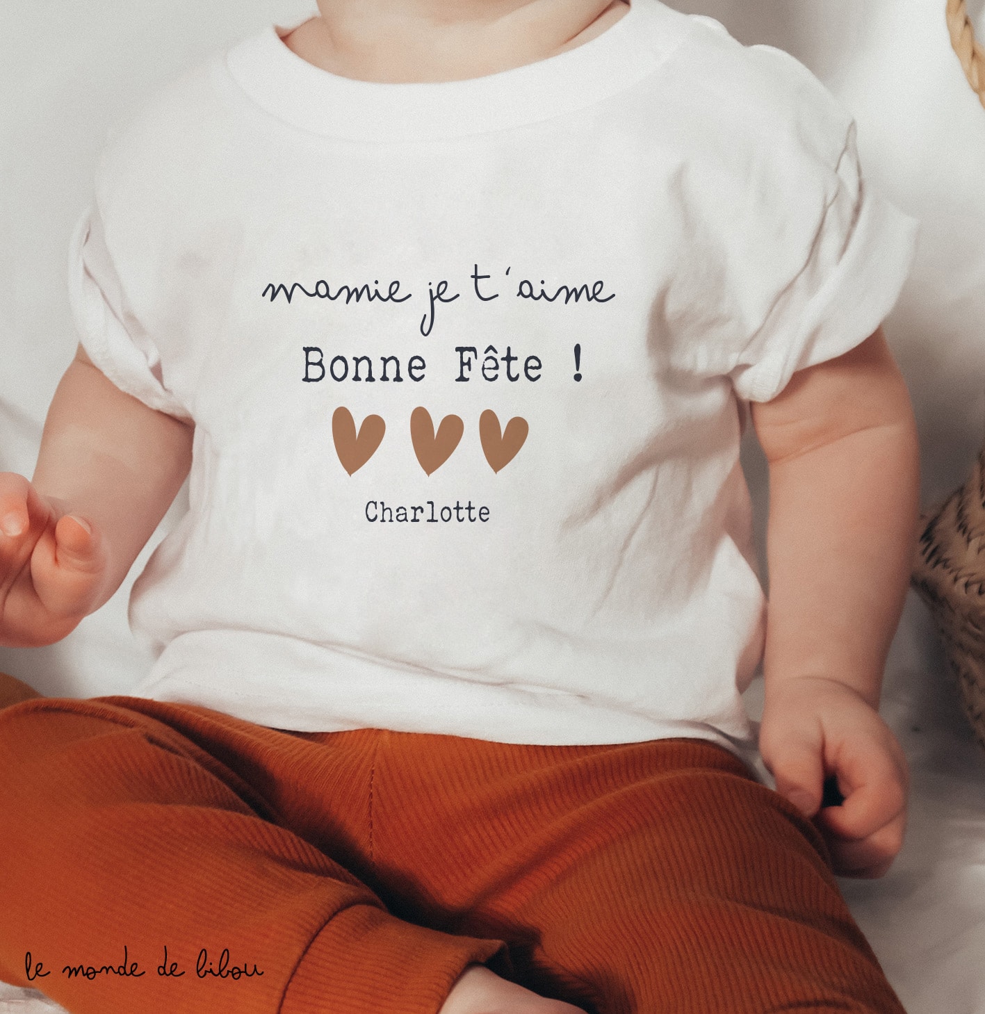- Texte : « Mamie je/on t’aime. Bonne fête – Prénom(s) du/des petit(s)-enfant(s) » Il est possible de ne pas personnaliser le t-shirt. En indiquant ‘ non personnalisé ‘ dans le champ prénoms