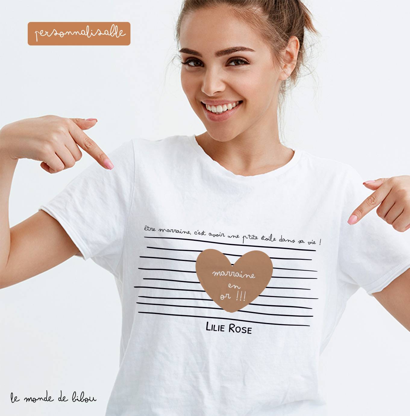 Voici un joli cadeau pour une super marraine, on adore ce T-shirt personnalisé Marraine en or ! C’est le cadeau idéal pour remercier la marraine de votre enfant. Un présent à offrir pour un anniversaire, une naissance ou à l’occasion d’un Baptême.