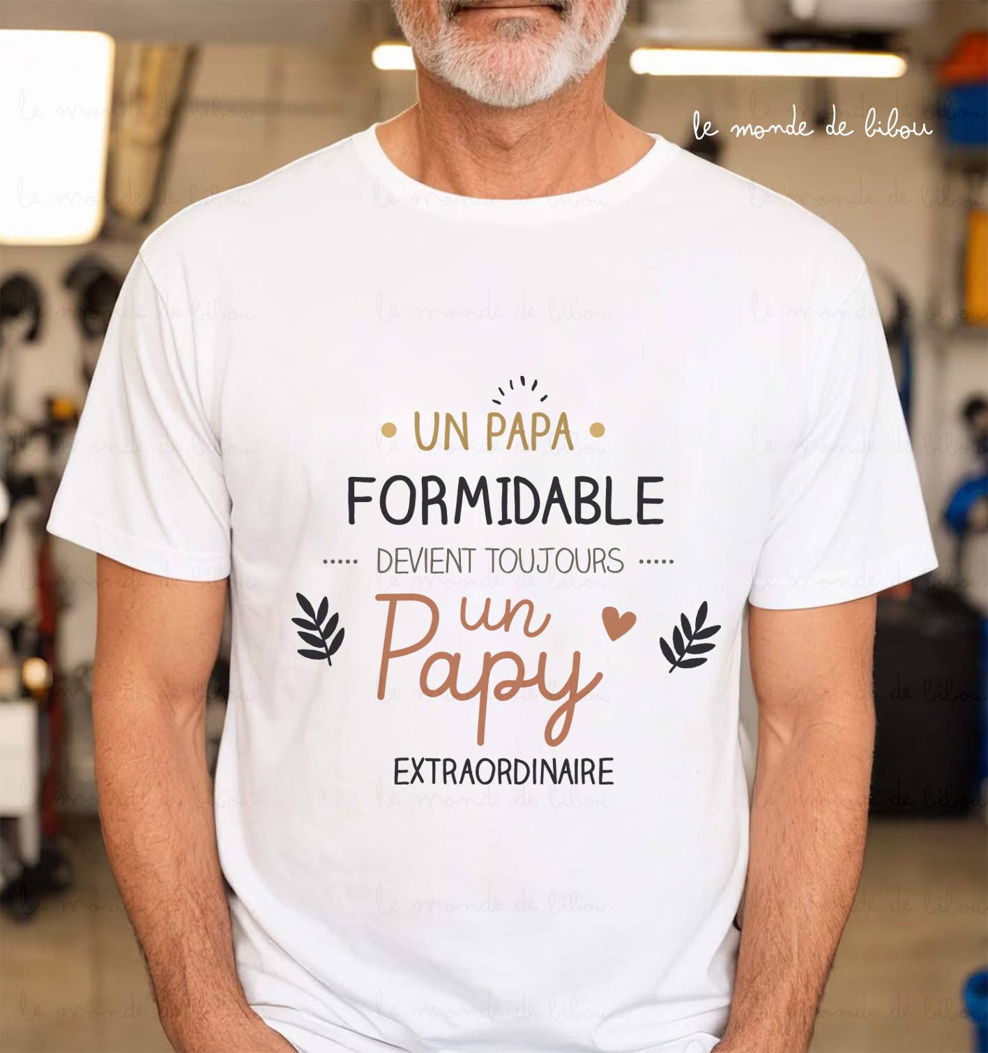 Voici un joli cadeau pour un super papy, on adore ce T-shirt personnalisé Papy extraordinaire ! C’est le cadeau idéal à offrir pour un anniversaire, une naissance, à l’occasion de la fête des grand-pères ou pour faire une annonce grossesse originale