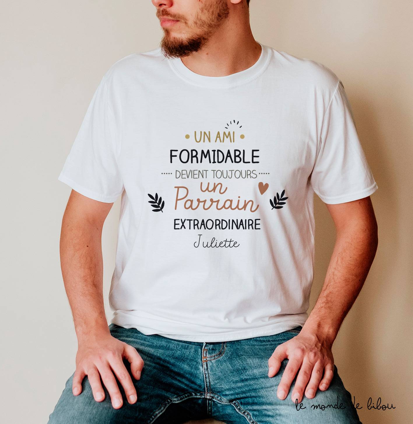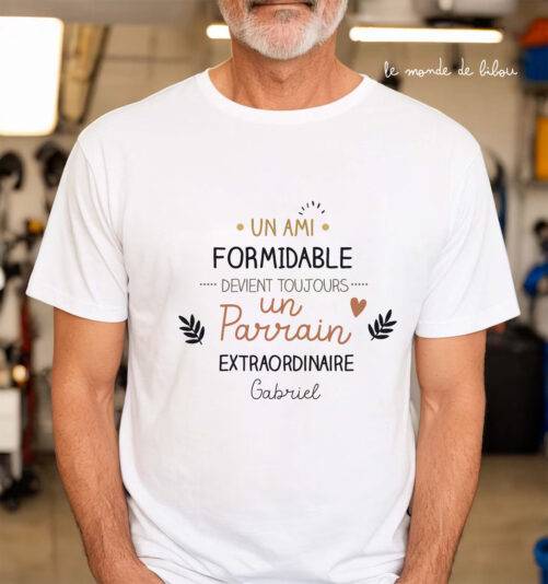 Voici un joli cadeau pour un super parrain, on adore ce T-shirt personnalisé Parrain extraordinaire ! C’est le cadeau idéal pour remercier le parrain de votre enfant. Un présent à offrir pour un anniversaire, une naissance ou à l’occasion d’un Baptême.