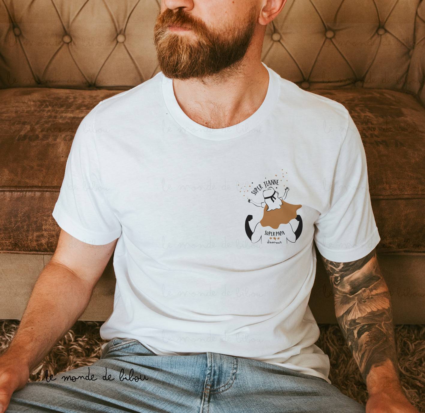 Voici un joli cadeau pour un papa d’amour, on adore ce T-shirt personnalisé super papa ! C’est le cadeau idéal à offrir pour un anniversaire, une naissance ou à l’occasion de la fête des pères. L’illustration super papa est unique, réalisée dans notre atelier. Le t-shirt est personnalisé au prénom de sa fille ou de son fils !