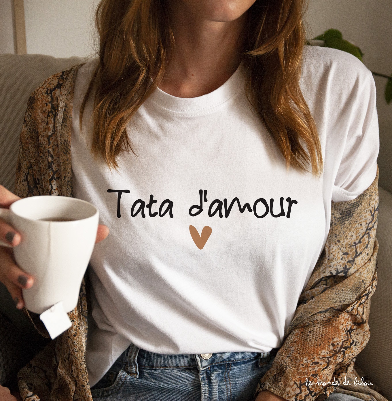 Voici un joli cadeau à offrir à la tatie de votre enfant, on adore ce T-shirt Tata d’amour ! C’est le cadeau idéal à offrir à l’occasion d’un anniversaire, comme cadeau de Noël ou juste comme ça pour faire plaisir à cette personne qui compte pour vous et votre enfant… Car une tatie c’est presque comme une maman mais en plus cool, n’est-ce pas ? 🙂