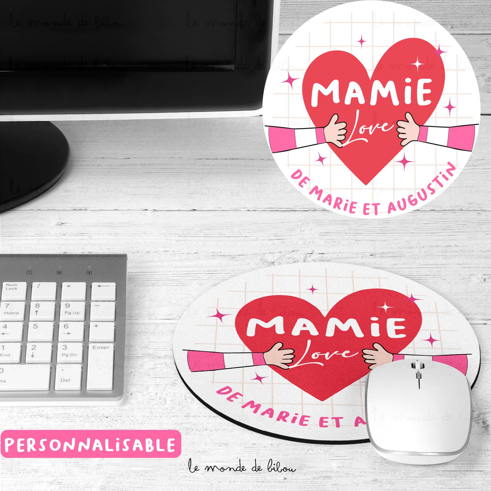 Faites plaisir à votre mamie avec ce tapis de souris unique et rempli d’amour. Ce modèle met en avant un joli cœur rouge tenu par deux petites mains, accompagné de l’inscription « Mamie Love » et des prénoms de ses petits-enfants. Ce design moderne et affectueux illuminera son espace de travail avec une touche de tendresse et de bonheur.